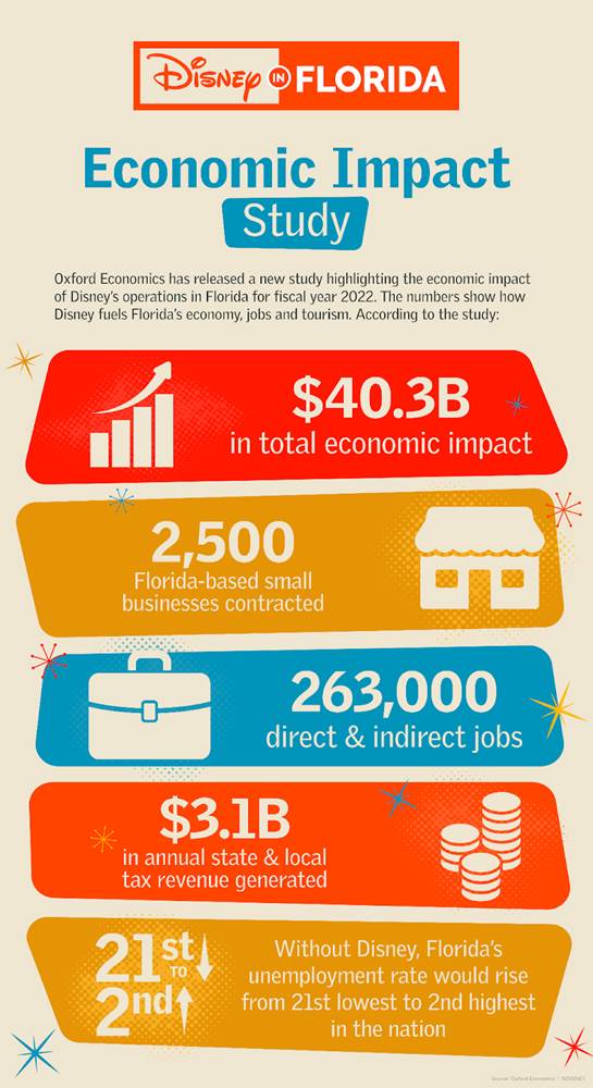 - According to Oxford Economics' report, Disney’s statewide economic impact on Florida totalled $40.3 billion in fiscal 2022.