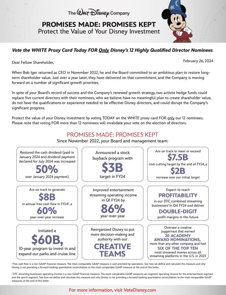 - The Walt Disney Company Board of Directors today sent a letter to shareholders detailing the progress it has made and continues to make on its strategic priorities, delivering on the promises it made just over one year ago.