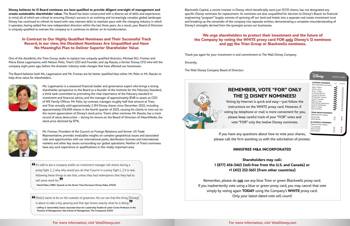 - The Board urges shareholders to protect their investment and the future of the Company by voting the WHITE proxy card FOR only Disney’s 12 nominees NOW and not the Trian Group or Blackwells nominees. The 2024 Annual Meeting of Shareholders will be held on April 3, 2024.