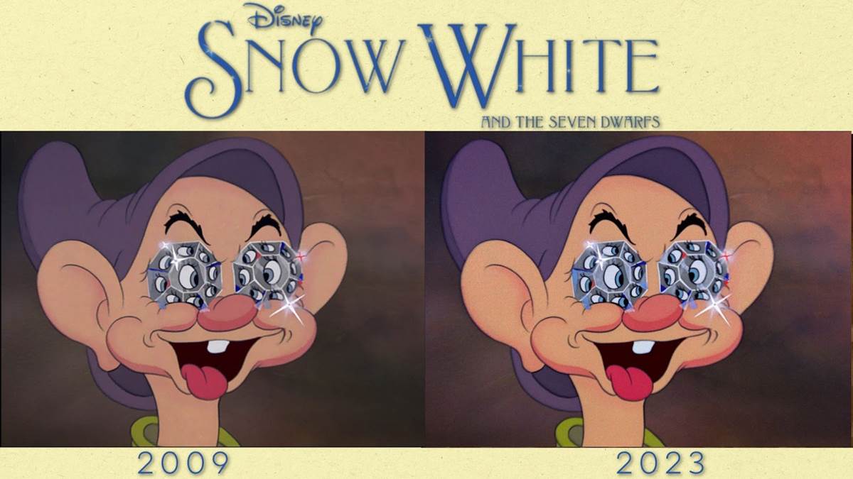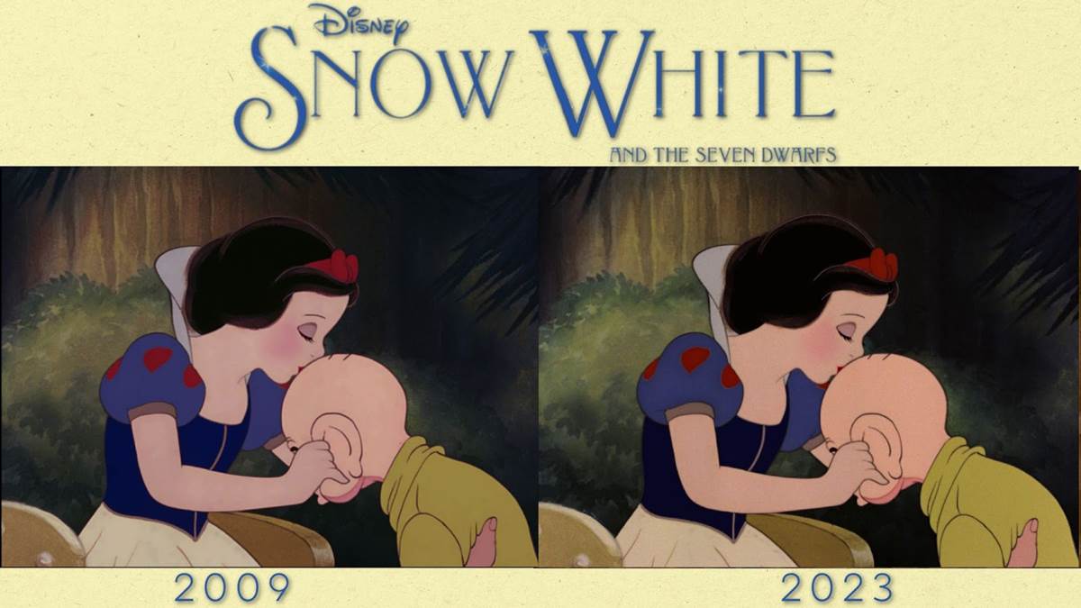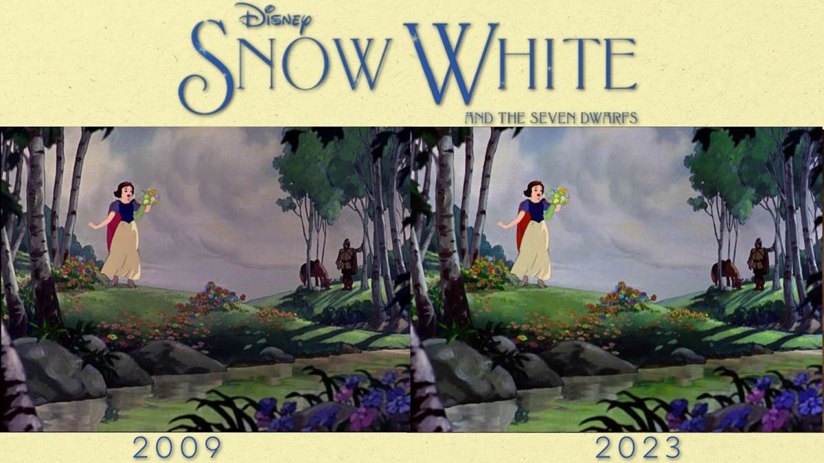 Saturation feels slightly increased in the 2023 version. I’ve read multiple stories about how, in 1937, Walt Disney was nervous that audiences would experience eye strain while watching an hour of Technicolor animated material. For this reason, the colors in the film weren’t bright by design. In motion, this restoration doesn’t feel brightened at all. But certainly, in comparison to the previous release, it’s hard to ignore that it is brighter.