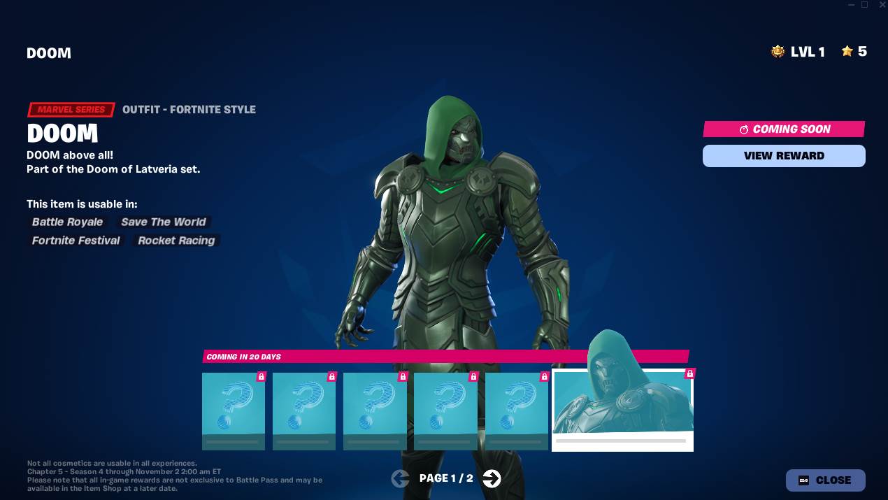 Additionally, players will have the opportunity to unlock the Doom skin through a series of challenges. These challenges are not available to complete as of yet, but in a later update to the season, players will be able to access quests that will allow them to add the villain’s cosmetic to their locker. Outside of the Doom challenges, additional content is available to unlock through quest rewards. Items from quests will also be rolled out through the duration of the season.