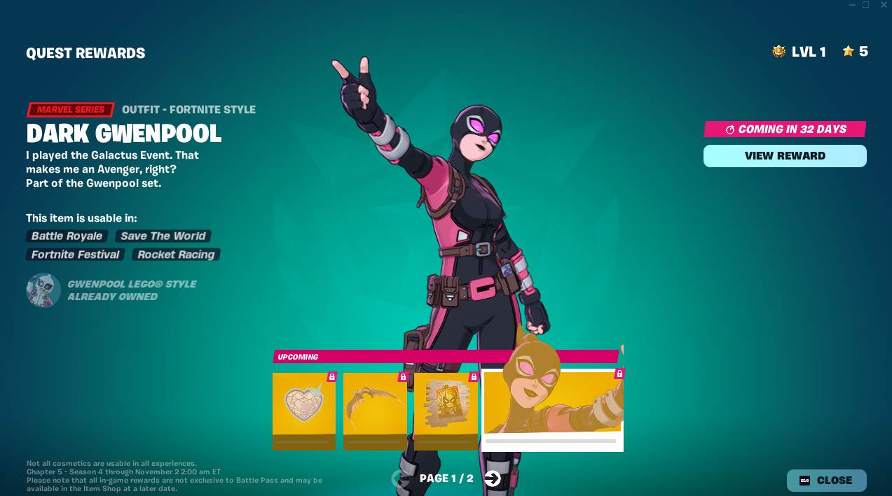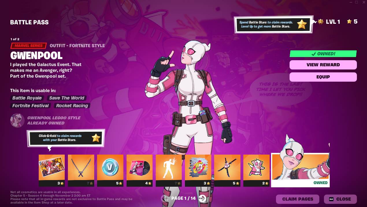 Purchasing the Battle Pass immediately unlocks the new Gwenpool skin. The cartoonish skin is players first taste of all the amazing Marvel content they can unlock by playing the new season. Let’s take a look at all of the items you can unlock.