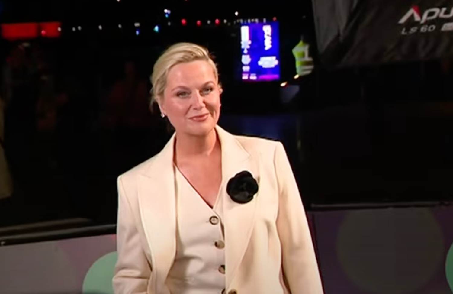 - Leading the arrivals, Poehler was photographed wearing a three piece cream suit adorned with a black flower to match a pair of black patent leather heels and stud earrings.