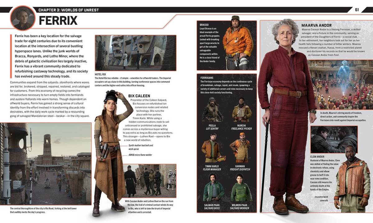 Divided into seven total chapters, this Visual Guide kicks things off with a timeline of events after the end of the Clone Wars and prior to the beginning of the Galactic Civil War, and then a map of the known galaxy to help readers get their bearings as they relate to this material. From that point on, Hidalgo and Shkoukani have broken down pretty much everything one might want to know about this roughly two-decade span of the fictional Star Wars chronology. They start with the players, vehicles, locations, and factions on the dark side of the Force and then flow into the Rebel Alliance itself, setting the galactic stage for the timeless battle between good and evil we knew from the original Star Wars trilogy. But here we zoom in on planets like Alderaan and Ryloth and groups like Clone Force 99 and the Inquisitorius who were active during this period. We learn more about the corporate interests that take hold on Ferrix and the Imperial Security Bureau that filters precious information through the Empire. There’s also the galaxy’s underworld, so important in the upbringing of characters like Han Solo and Lando Calrissian, that gets explored in-depth in these pages.