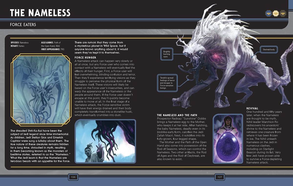 The other minor but still unnecessarily convoluted system of organization is the insignia on the top right of each entry that indicate in which Phase each character appears. These are represented by three insignia of ever-so-slightly different colors, instead of just… well, putting a Roman Numeral I, II, or III there. I think changing those confounding decisions on the editorial level would have improved the book by leaps and bounds, but otherwise I still enjoyed it quite a bit and already consider it invaluable as a resource, considering I spend a significant amount of my time combing through The High Republic content (the alphabetical index on the final page is also quite helpful for those purposes). As far as illustrations go, the book’s gorgeous cover art has been created by renowned painter (and former Disney animator) Phil Noto, while the interior artwork is drawn from a number of sources, including comic-book covers and interiors, concept art, video game screen-captures, and animation designs.