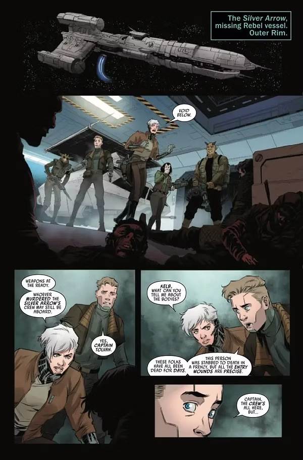 Doctor Aphra (2020) #37 begins with Imperial Officer turned Rebel Alliance Captain Magna Tolvan investigating a derelict rebellion ship with her ragtag crew. There, they find all the humans dead and are soon overrun with the ship’s murderous droids, all of whom have been infected with the virus-like consciousness of the evil artificial intelligence known as the Scourge. Meanwhile, on the Tagge Corporation research station Casus Belli, rogue archaeologist Dr. Chelli Lona Aphra and her colleague assassin Just Lucky are received by Lapin Tagge after their mission to Havel Prime. Of course, that planet isn’t the only place in the galaxy being overtaken by the Scourge virus, as Chelli and Lucky quickly discover.