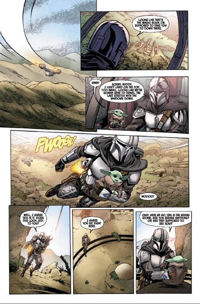 The Mandalorian Vol. II #6 is an adaptation of the memorably eventful episode entitled “The Tragedy" from the smash-hit series’ second season. Fans will remember this installment as the one in which bounty hunter Din Djarin and his diminutive ward Grogu travel to the planet Tython after being advised to by former Jedi Padawan Ahsoka Tano. There, they find a rock formation atop a mountain and a seeing stone within it, on which Mano perches young Grogu to see if he can use it to connect to the Force or other Jedi.