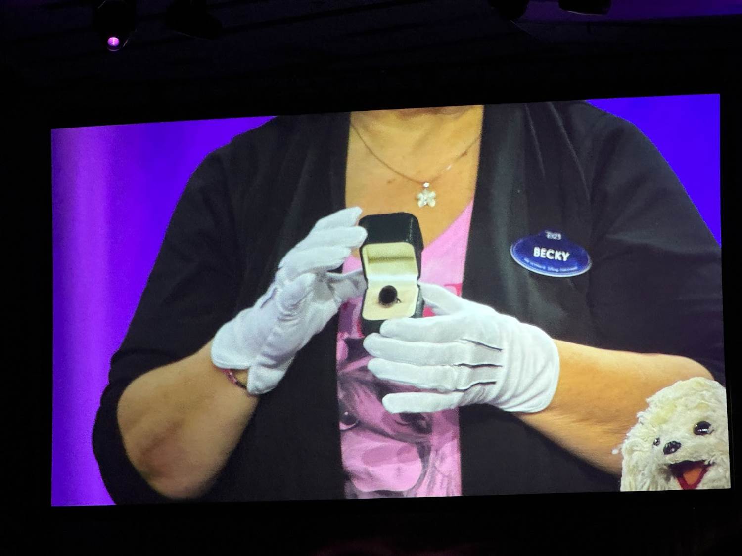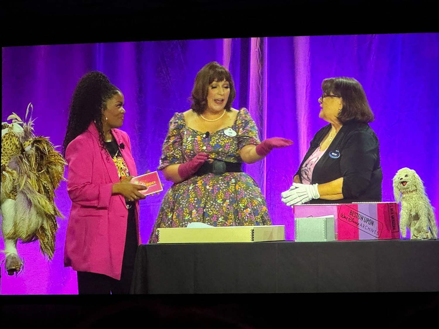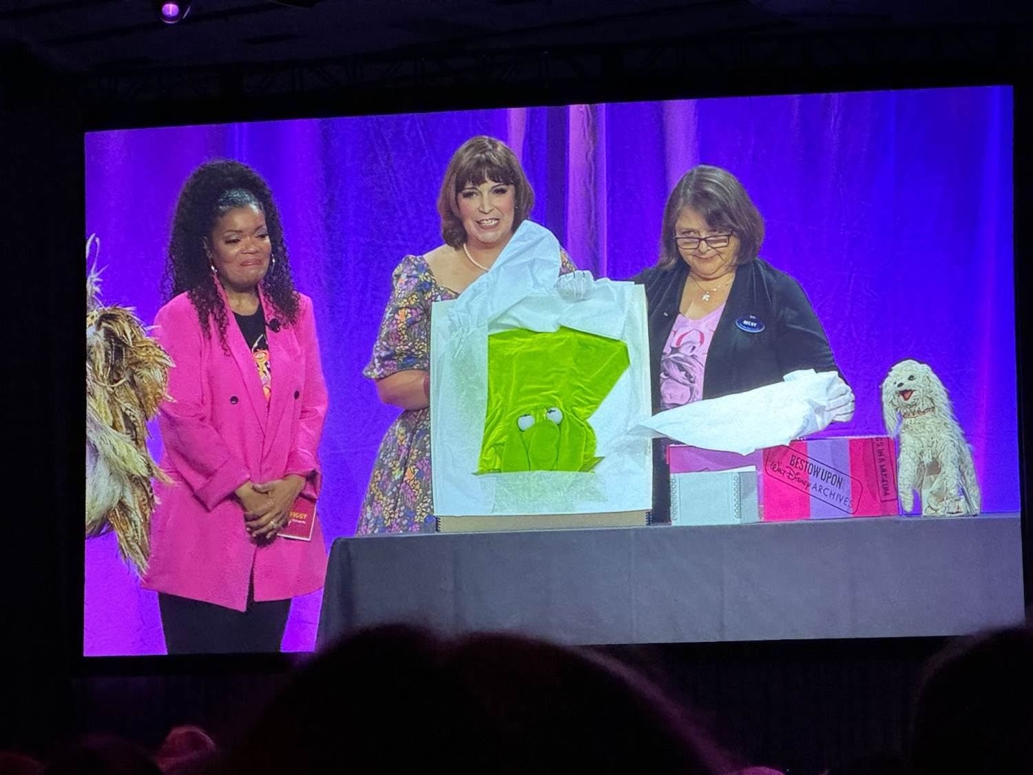 The panel started out with Becky Cline talking about how special the Muppets are to the Walt Disney Company, and then she began unveiling the objects underneath a cloth on the table. The first archival prop was the “Miss Bogen County" sash prop worn by Miss Piggy in 1979’s The Muppet Movie.