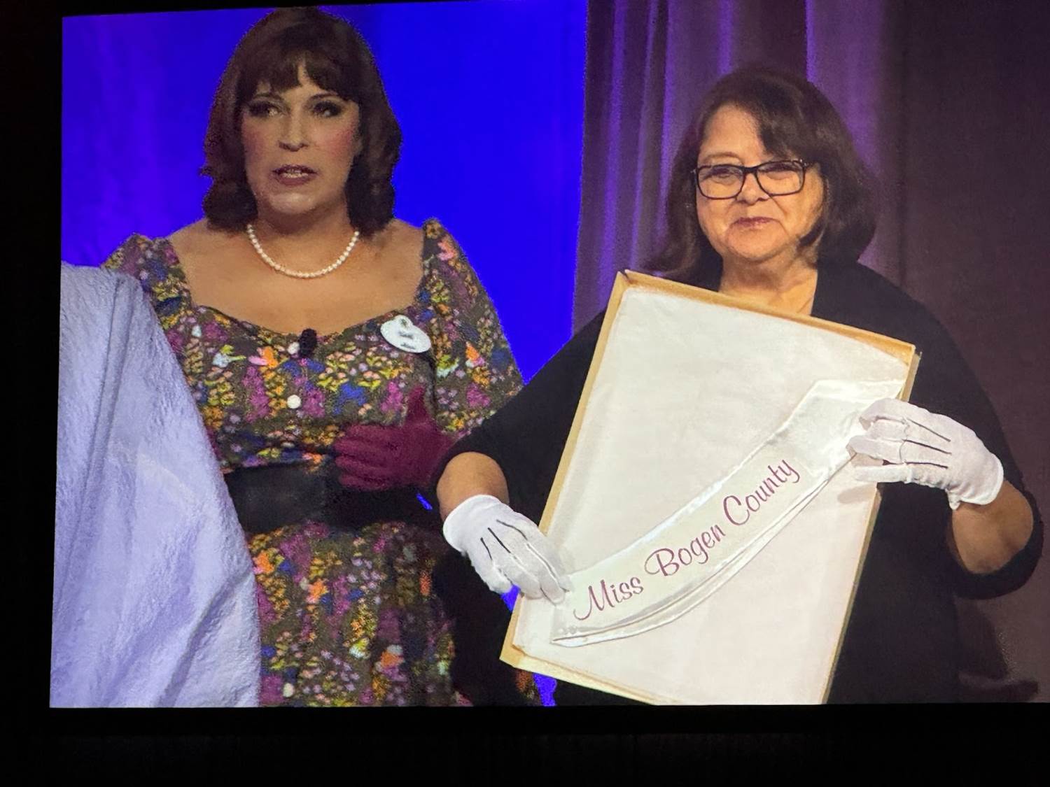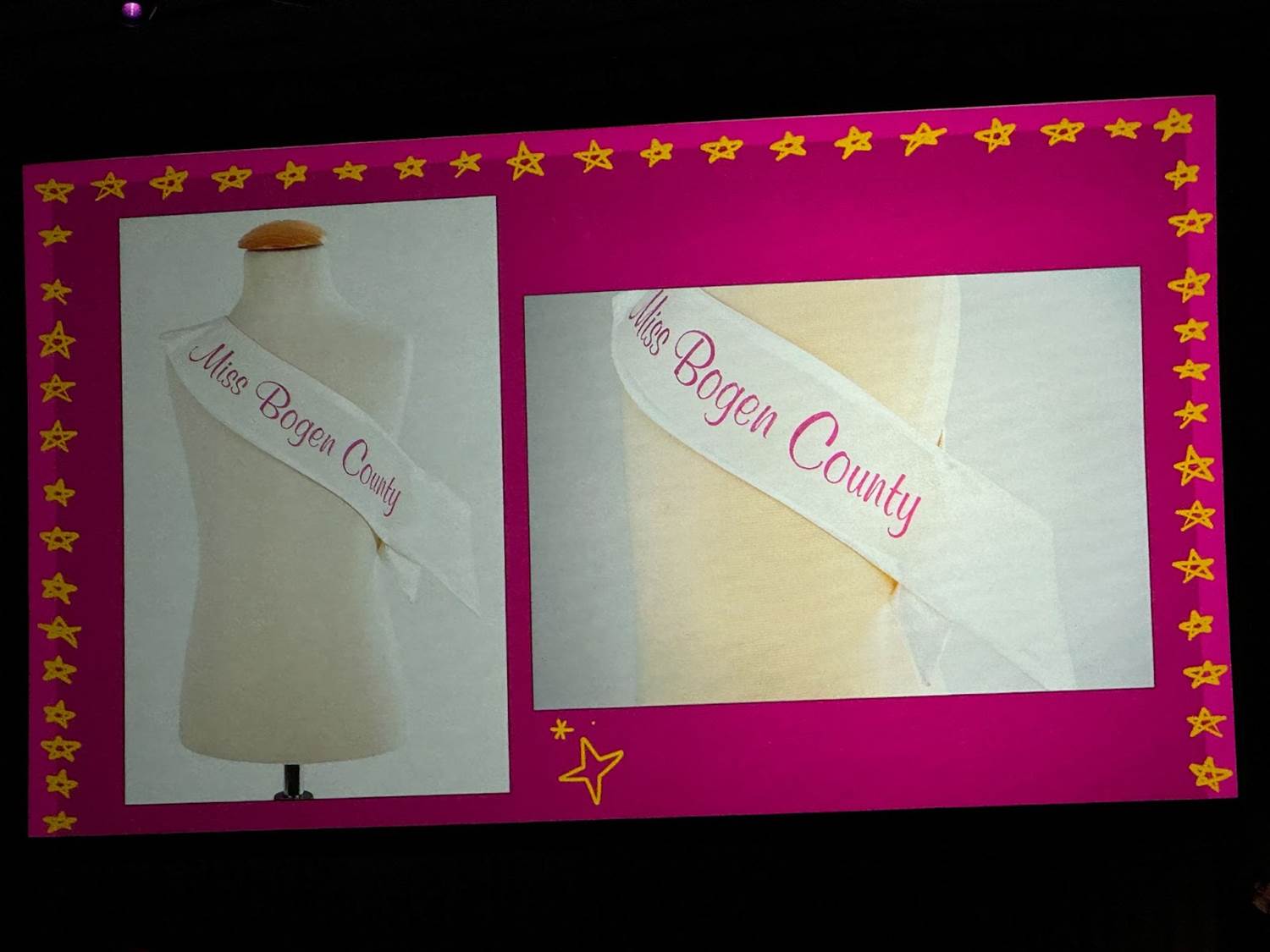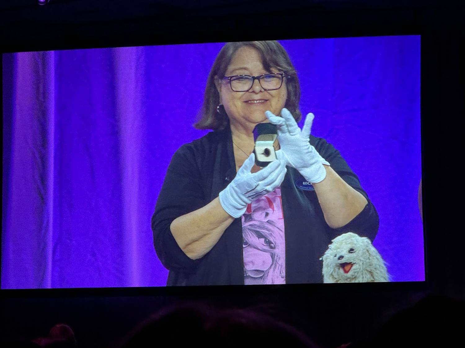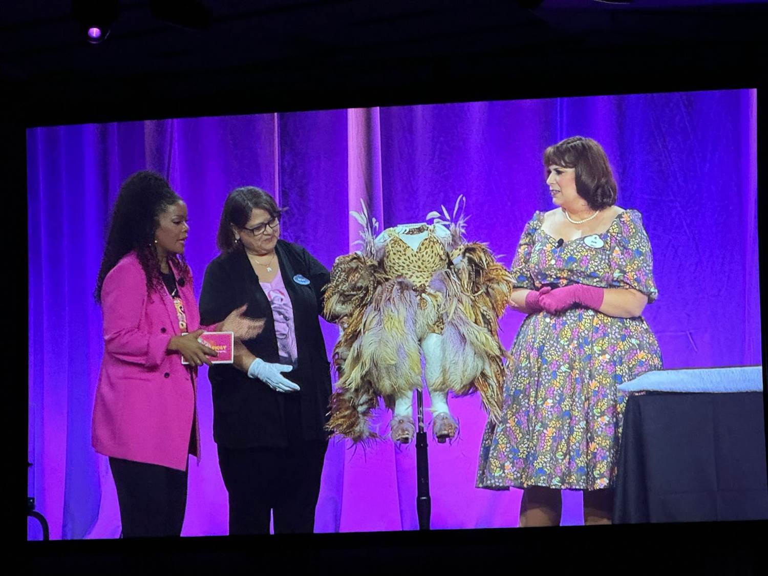 The panel started out with Becky Cline talking about how special the Muppets are to the Walt Disney Company, and then she began unveiling the objects underneath a cloth on the table. The first archival prop was the “Miss Bogen County" sash prop worn by Miss Piggy in 1979’s The Muppet Movie.