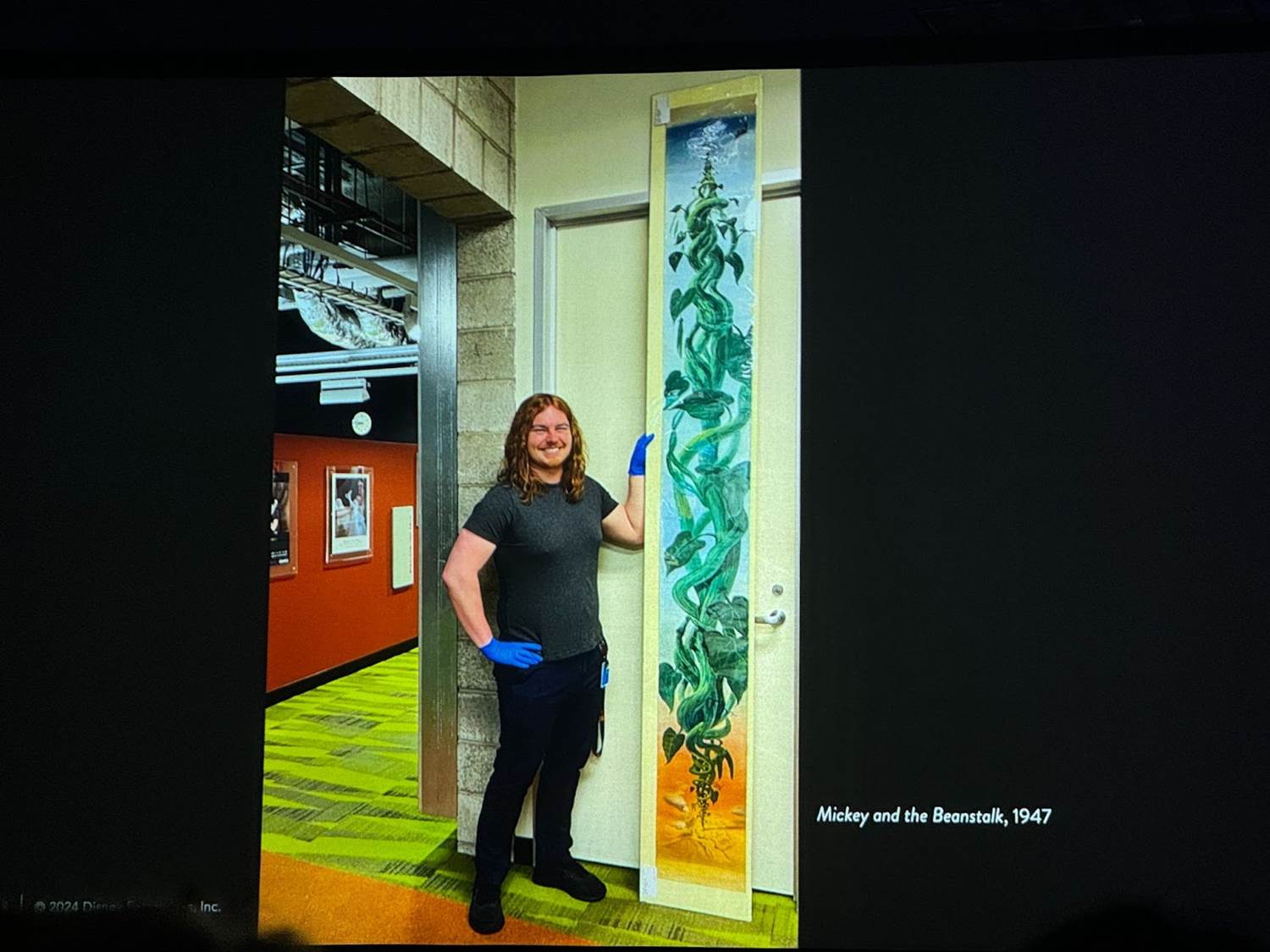 And here’s Brian again, this time posing next to an 8-foot-tall hardboard background used for the “Mickey and the Beanstalk" segment of Fun and Fancy Free, released in 1947. The largest of these in the ARL is over 23-feet-long, created for The Three Caballeros.