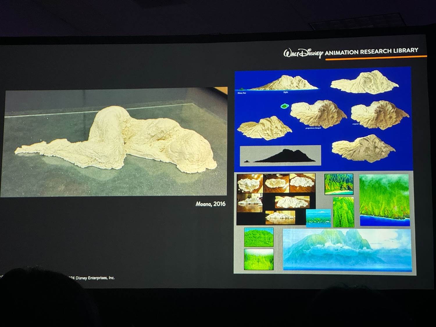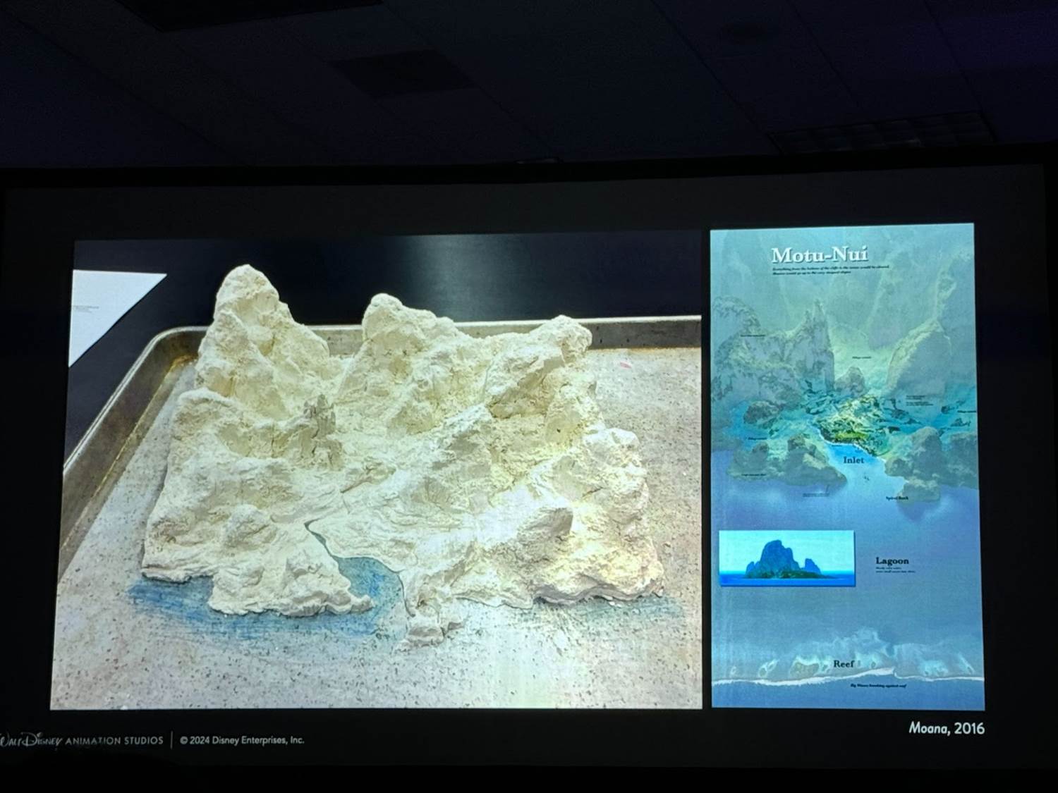 There are two unusual models at the ARL from Moana. This model of Moana’s home island Motunui was made by hand by Andy Harkness, who served as art director of environments and color on the film. Rather than try to sculpt the island in the computer, he used sculpting clay on a cookie sheet. It dried there, so when this asset came to the ARL, it became their first (and still only) cookie sheet, as removing the model from it risks damaging the clay.
