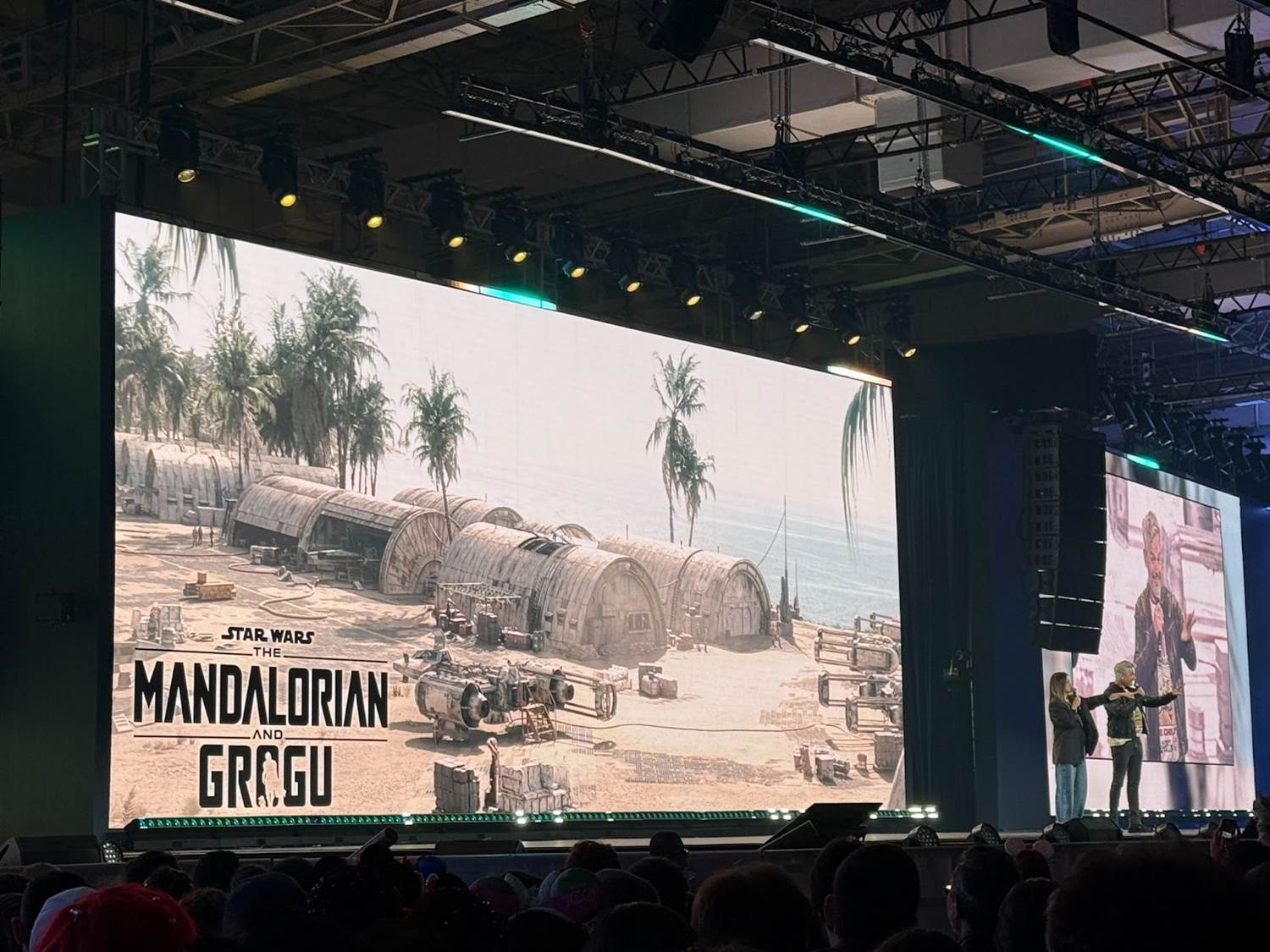 The highlight of the Lucasfilm portion of the showcase was footage from The Mandalorian and Grogu, a theatrical adventure spun off from the hit series. Director Jon Favreau and producer Dave Filoni filmed a video for D23 Brazil attendees from the film’s set and mentioned that some scenes are being shot in IMAX ratio. Some footage was shown, including Zeb Orrelios (from Star Wars: Rebels) in live-action; Din Djarin and Grogu falling down a snowy hill in an open-air All Terrain Scout Transport and crashing in front of some AT-ATs; and Grogu riding in the cockpit of a tiny ship piloted by two Anzellans (Babu Frikk’s species).