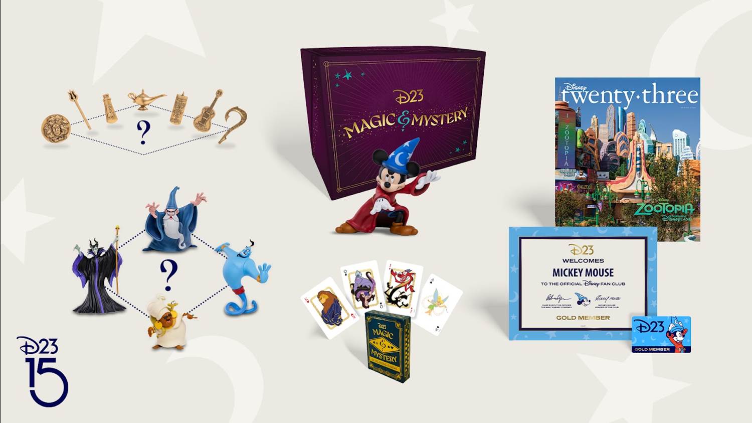 - Celebrating the stories that foster classic Disney magic and paying tribute to magician kits of yesteryear, the D23 Magic & Mystery Box Collector Set boasts an illustrious lineup with a Sorcerer’s Apprentice Mickey Mouse collectible figurine, a mystery companion collectible figurine, a deck of playing cards, and a mystery pair of beautifully sculpted pins, as well as a Membership Card and Certificate—which will be available to all new and renewing D23 Gold Members in 2024!