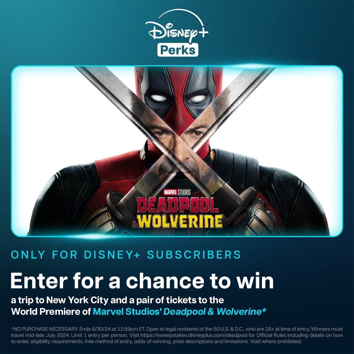 - Starting today, Disney+ subscribers in the U.S. can enter for a chance to win a pair of tickets to the World Premiere of Deadpool & Wolverine in New York City.