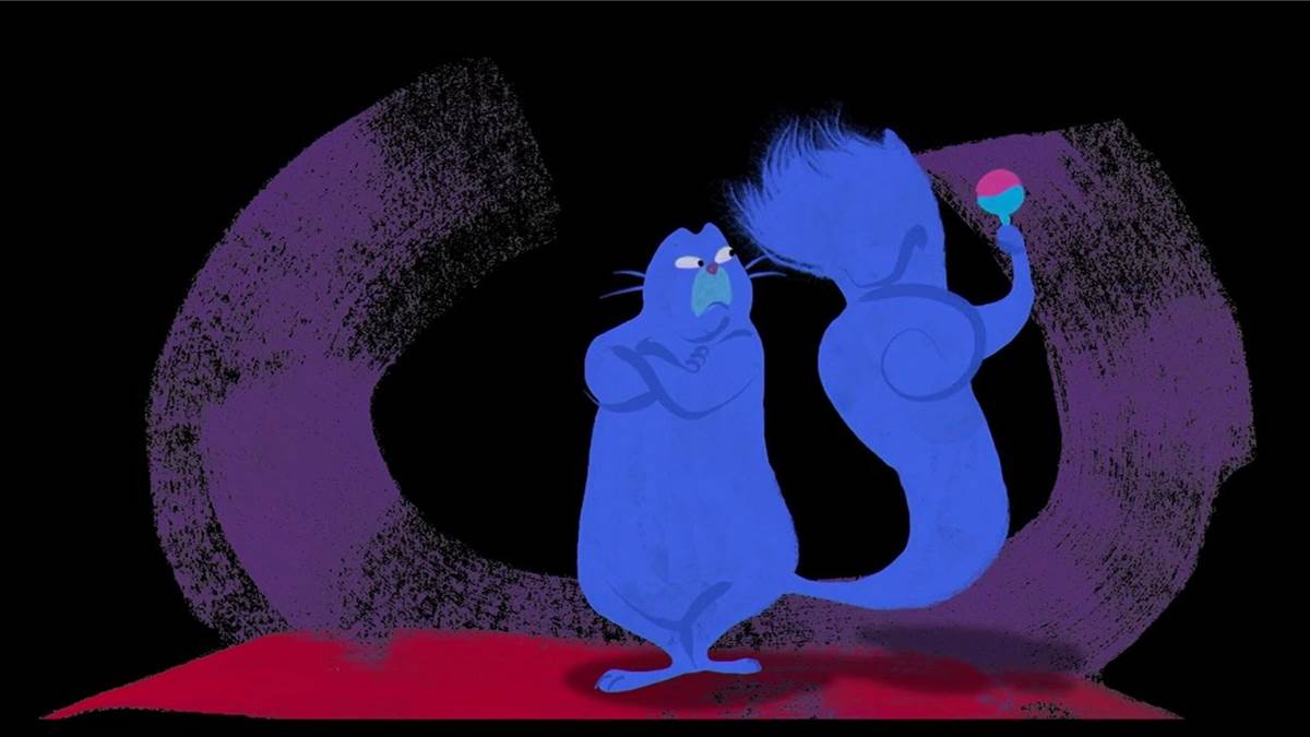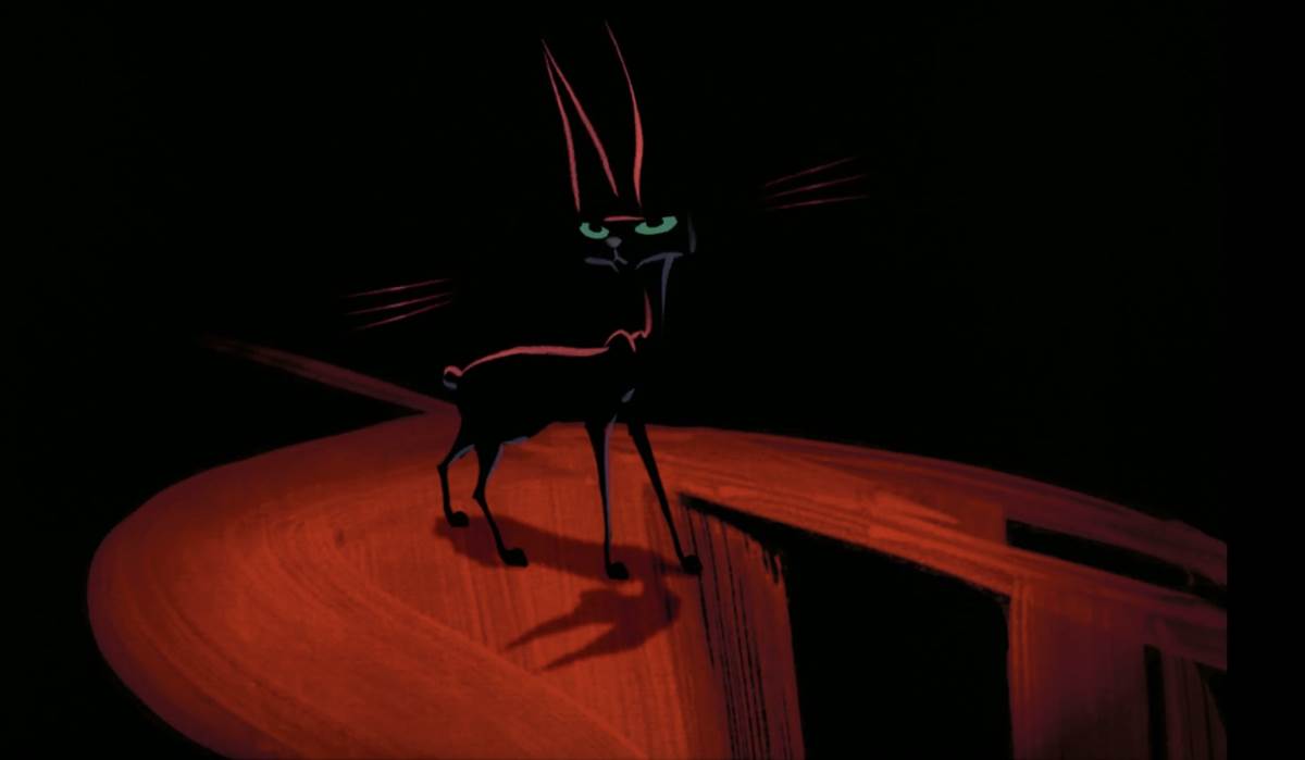 A tango, (which was also suggested by Don Hahn) after all, traditionally covered dark content. They were usually about a relationship where someone was cheating and a knife would inevitably be involved. But how is Lorenzo dark? Well.. aesthetically, yes. Gabriel originally loved the idea of having bright colors on a solid black background, and most of the art was done this way with tempera paint on black paper. In terms of story, however, equally as dark. Lorenzo tells the story of a spoiled cat, Lorenzo, who is on his perch in a cafe looking down at the cats on the street through a window. There, he teases them by eating delicious shrimp and even breathes on the glass, drawing a sad face and adding a tear (a note suggested by future Frozen and Wish director Chris Buck). One particularly evil-looking cat walks by, and is notably missing their tale. Lorenzo makes fun of this, showcasing his own very large and fluffy tail, teasing the cat. The tailless cat casts some kind of magical curse upon Lorenzo and his tail, which now has a mind of its own. While the tango track has been playing this time, now it takes full effect as the tail puts the cat through a malicious hell, all while dancing…you guessed it…a tango.