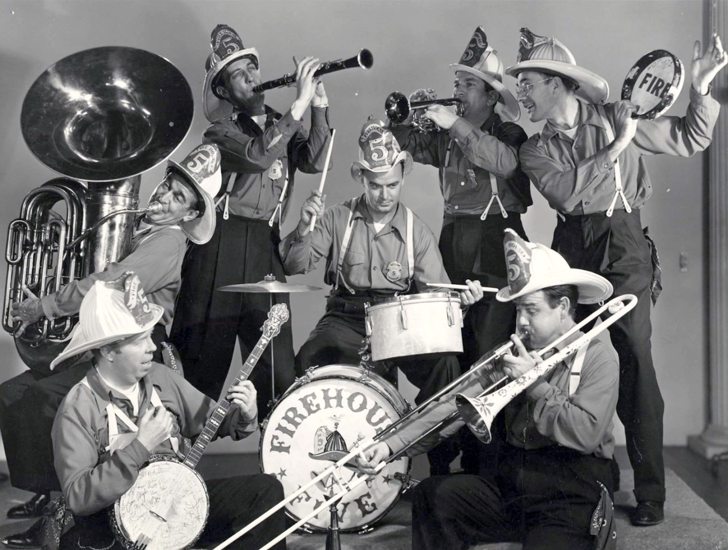 The Dixieland Revival band improved to the point where they started playing professional gigs outside the studio. Looking to add a little extra color and flavor to the band, Ward took the advice of his wife Betty and added a gimmick to the band’s appearance - which came in the form of a turn-of-the-century antique fire truck. Ward got the band matching shirts, pants, suspenders, and hats, and they played a couple gigs as the Firehouse Five - arriving to gigs in a big bustle aboard their vintage fire truck. The alliterative name led to some confusion with the local nightclubs and patrons, as the band actually included seven members. A fix presented itself quite accidentally, when one of the band members added “Plus two!" to the band’s name when they were introduced at a gig. The momentary fix stuck, and the band officially became known as the Firehouse Five Plus Two.