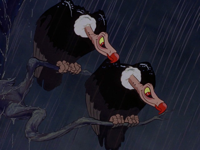 Ward’s first crack at full feature animation came as part of the animation team for 1937’s Snow White and the Seven Dwarfs. Ward was tasked with animating a lighthearted song sequence where the dwarfs feast on bowls of soup. The unfinished sequence was a work of beauty, but Walt Disney chose to cut it from the final film. Walt recognized that the presence of the scene was causing pacing issues with the film as a whole, slowing down the plot and failing to add character depth. While Walt’s decision was based on sound rationale and not at all a negative reflection on Ward’s animation work, Ward still felt crushed by the decision. He had invested months of time into the scene, and he felt discouraged to say the least. After a couple days of introspection, Ward visited Walt - preparing to offer him his resignation. Walt understood Ward’s feelings, and - knowing Ward’s immense talent and value to the studio - offered him a couple of alternate projects to animate. The first of these was the scene near the end of Snow White where the Evil Queen - in the form of the old witch - falls to her death. Those two opportunistic vultures who swoop down after the witch falls - those are all Ward Kimball.