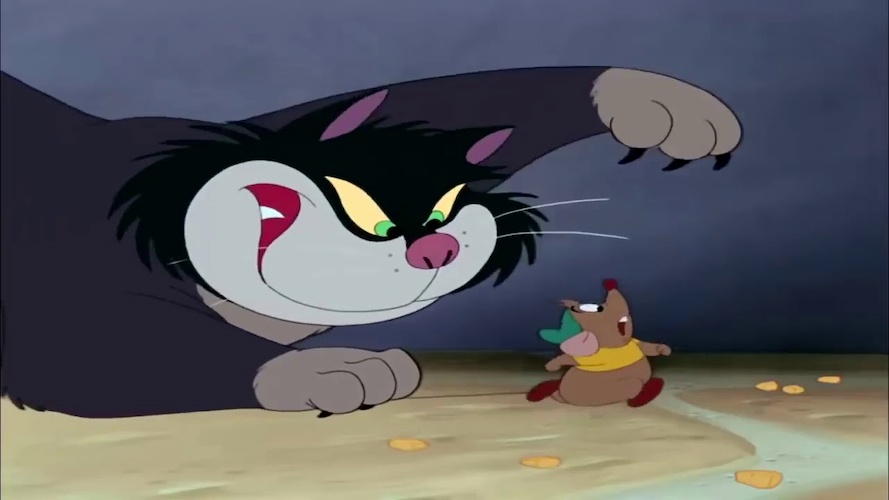 By 1950, the Disney Studios had developed a realistic style of animation. With every passing picture, Disney artists and animators were improving their ability to simulate life and natural movement in their characters. Ward still preferred the exaggerated and caricature-type features of the classic shorts. So when Ward was invited to work as directing animator on the 1950 film Cinderella, it wasn’t to animate any of the human characters. Ward was given Lucifer the cat, and Gus and Jaq - Cinderella’s friendly mice pets. The goofy hijinks of the mice, and the madcap battle between them and Lucifer fell in Ward’s sweet spot, and he excelled at the sequences involving these furry characters.