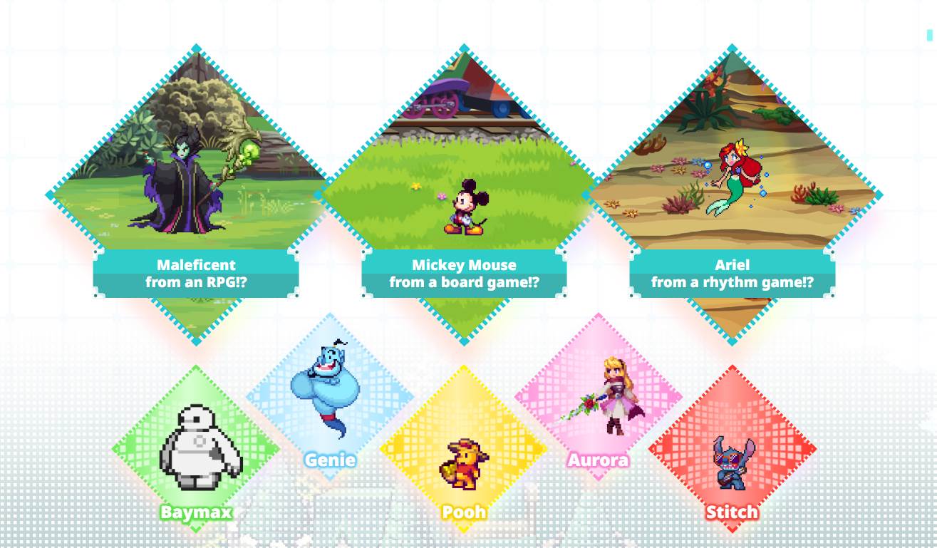 - The combat based game will allow players to head out with pixel art style Disney characters on unique adventures with unexpected encounters.