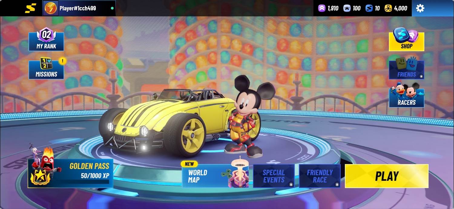After finishing the brief controls tutorial, you are welcomed to the games main menu. However, Speedstorm isn’t ready to let you slam on the gas just yet. Players will be toured through the game's menus, store, character list, and rank system. Unlike full priced racing games like MarioKart, Disney Speedstorm requires players to unlock and upgrade characters through in-game currencies which are acquired through challenges, seasonal Golden Passes, increasing player rank and micro-transactions.