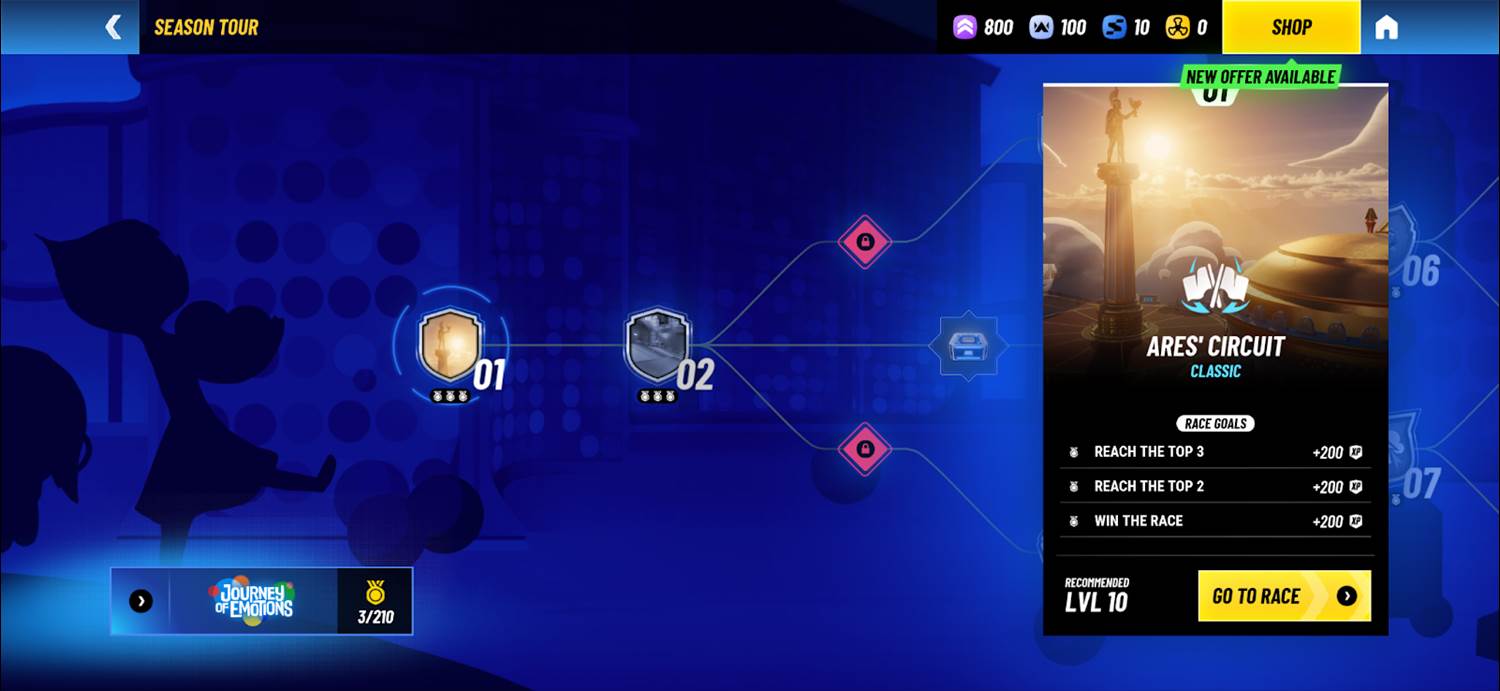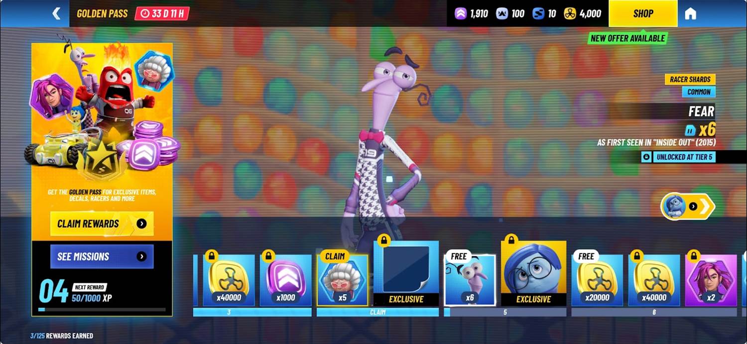 While it looks like quite a bit to explore, you, unfortunately, need to have characters unlocked to explore the smaller worlds. The game operates on a Season Pass system, with the smaller planets encompassing archived challenges from past seasons. Currently, Speedstorm is celebrating the Journey of Emotions Golden Pass inspired by Inside Out 2. This challenge path is open to all players, regardless of characters. When entering the Journey of Emotions world, racers will be presented with a trail of challenges that allow them to gain experience points towards the current Season Pass. The Season Pass is a list of unlockables that players can use in-game, which includes characters and add-ons. Some items in the pass are only available with the premium Golden Pass upgrade, which costs $8.99. The challenges are incredibly fun, with races containing goals that unlock XP (Experience Points).