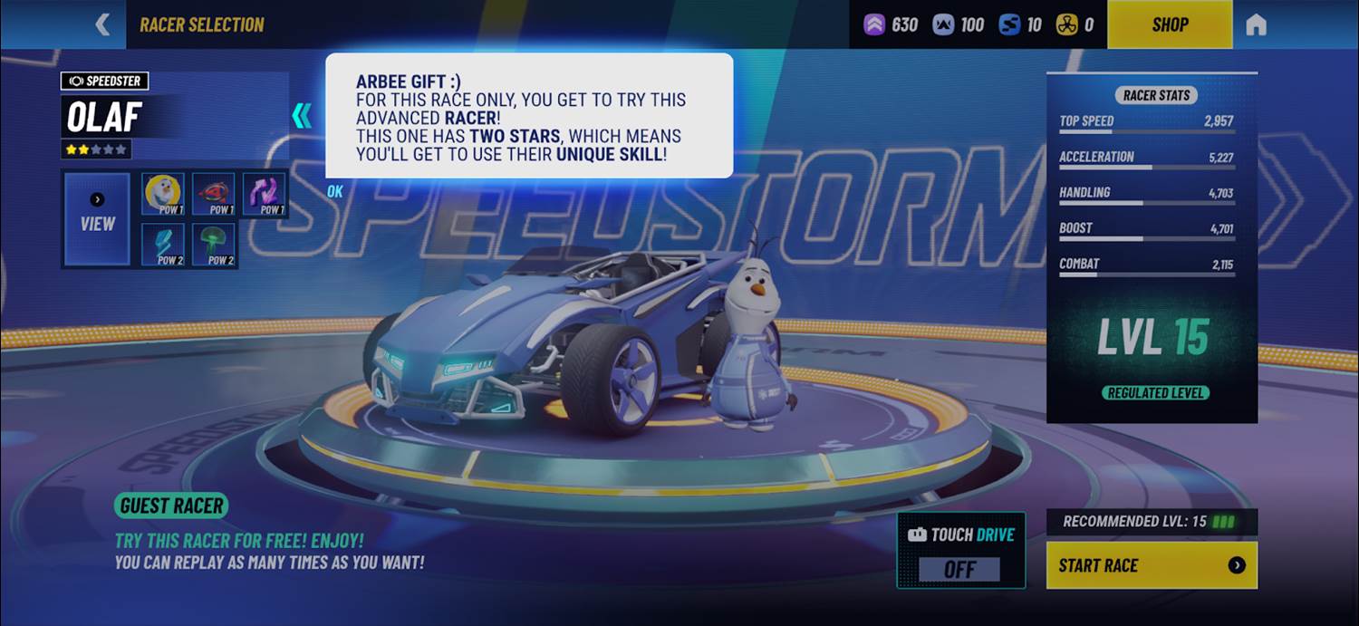 Each race has a recommended level, which correlates to your character's level not your rank. To upgrade characters, players will have to spend Upgrade Coins. Other races require you to play as a specific character or give you the opportunity to try a new character. Each Disney character has their own strengths, weaknesses and special attacks, giving the gameplay variety when you switch who you are racing with. Olaf was particularly fun, with a snowball-throwing special attack that spunout drivers when hit.