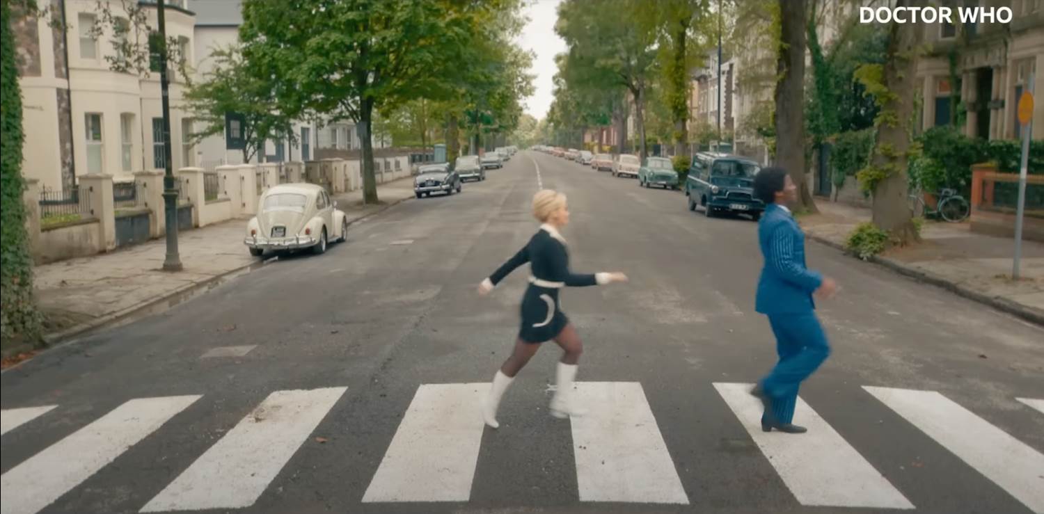 The Doctor (Ncuti Gatwa) and Ruby are seen crossing the street at Abbey Road, recreating the famous Beatles photo, in the second episode, “The Devil’s Chord."
