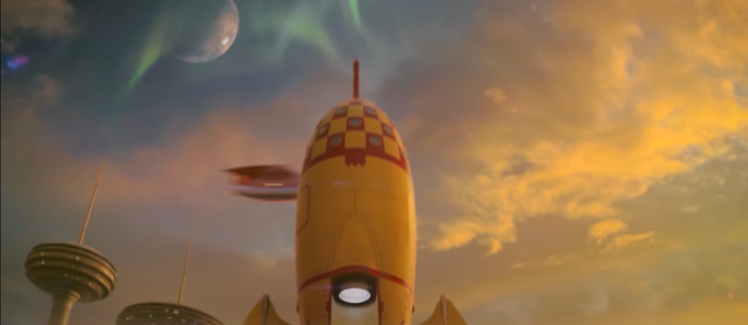 We then see a point-of-view shot of a spaceship blasting off from Earth.