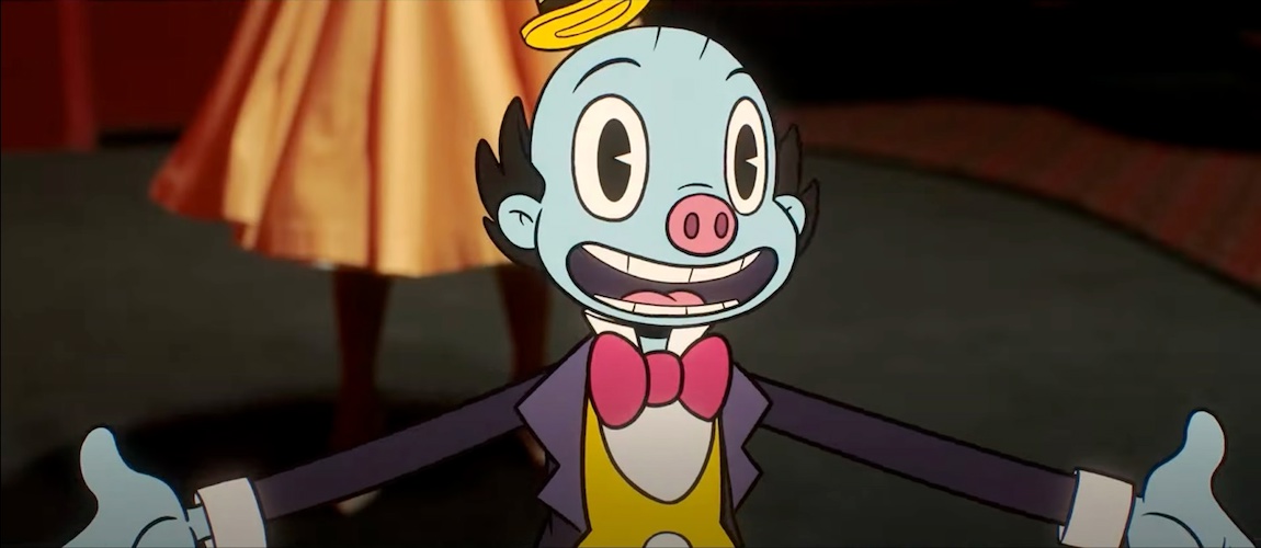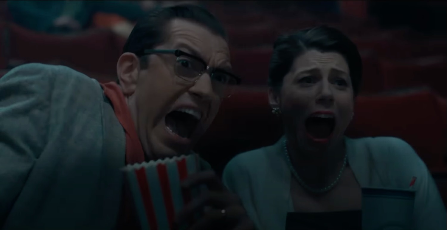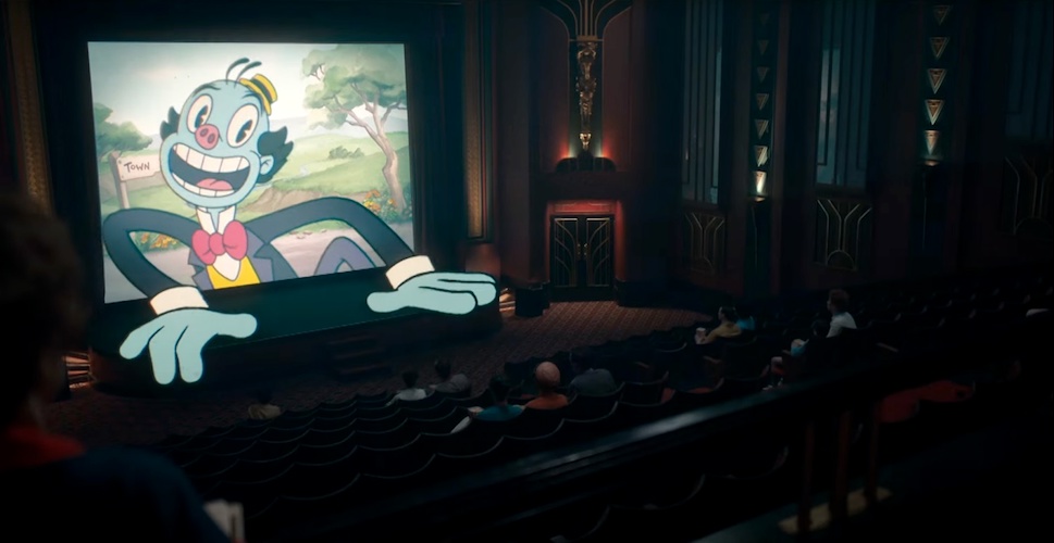 While we saw this in the previous teaser, it's worth including once again, as we get an impressive shot of Mr. Ring-a-Ding appearing to claw his way out of a movie theater screen as two patrons react in terror.