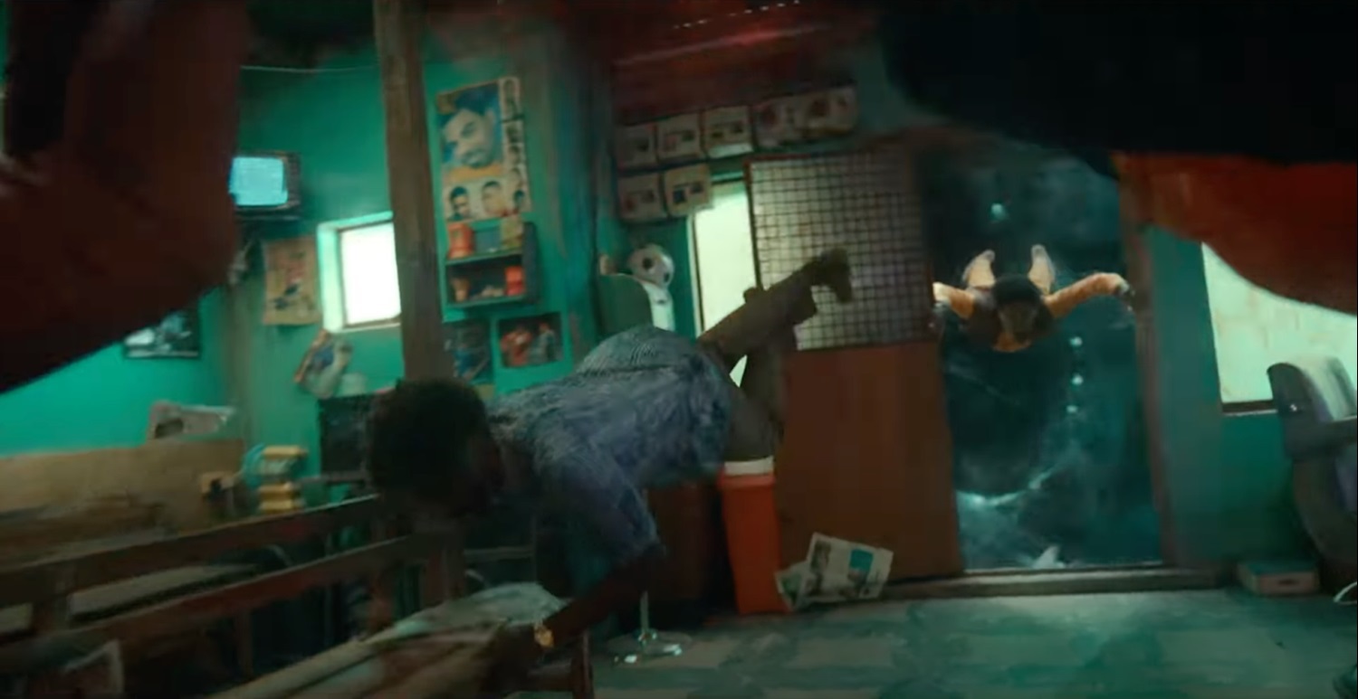 What appears to be a workshop or restaurant from perhaps the 1970s is then seen floating through space, with the Doctor and others hanging on for dear life.
