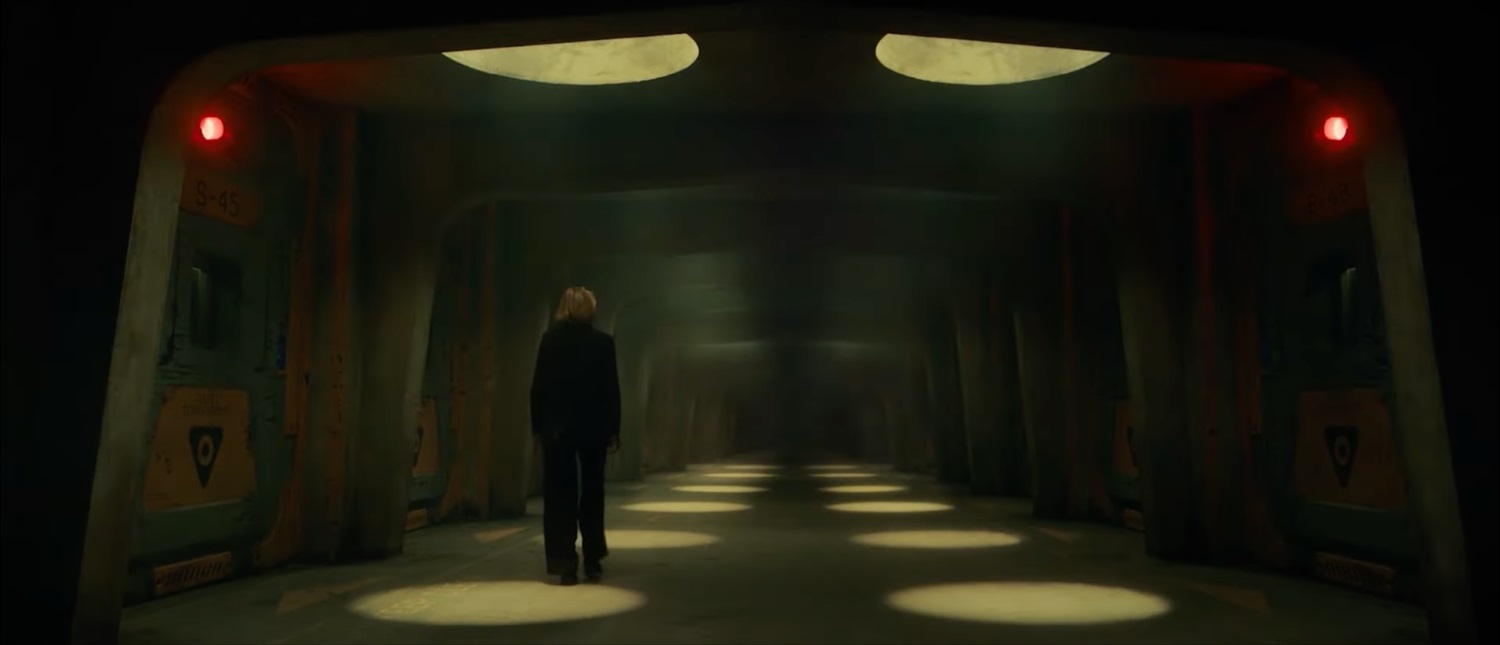 UNIT’s Kate Lethbridge Stewart (Jemma Redgrave) is walking down a hallway when she comes across a door, in which a hand appears through the window. The Doctor continues, “and when these vast creatures look down on us, our entire reality is in danger."