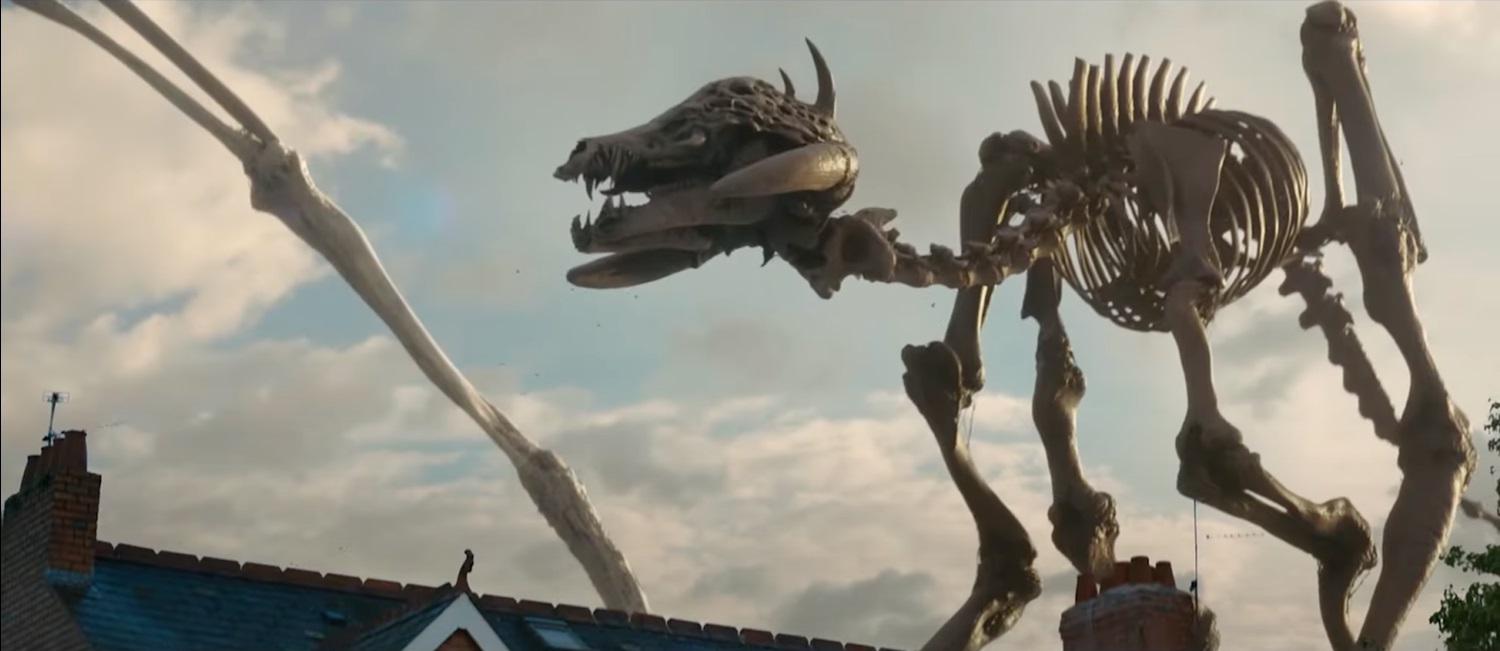 The Doctor appears in one of his many new costumes for the season, looking rather dapper while looking up at a giant rampaging skeletal creature.