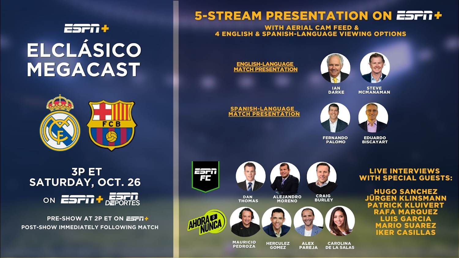 - ESPN+ MegaCast of the 258th ElClásico is the networks first multi-channel coverage of a soccer match in English and Spanish, offering new ways for sports fans to experience one of the world’s greatest rivalries.