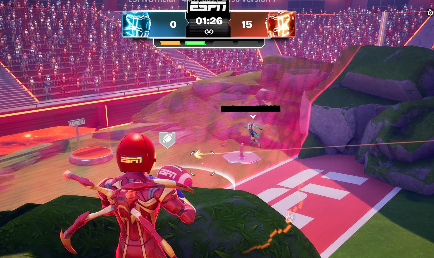 Finally, let’s take a look at Touchdown Rush, the main event of the ESPN Football Islands. Hosting up to 24 players, two teams of 12 will take turns rushing the football across the field as the other team attempts to stop them from moving the ball forward. The large football contains a ring around it, and when players on the offensive team are standing in it unopposed, the ball will move forward. This is not a straight shot across a normal field, with large rock formations and caves forcing the ball through a predetermined path around the obstacles. Each quarter, players will choose a weapon loadout to take on the opposing team. The higher your ESPN rank, the more weapon sets you have to choose from. With their chosen loadout, players on both teams will attempt to eliminate each other, forcing them to respawn at their respective end of the field, as they attempt to move or stop the football. For each fieldline passed, the offensive team will gain a point. Each team gets two turns on the offensive and defensive sides.