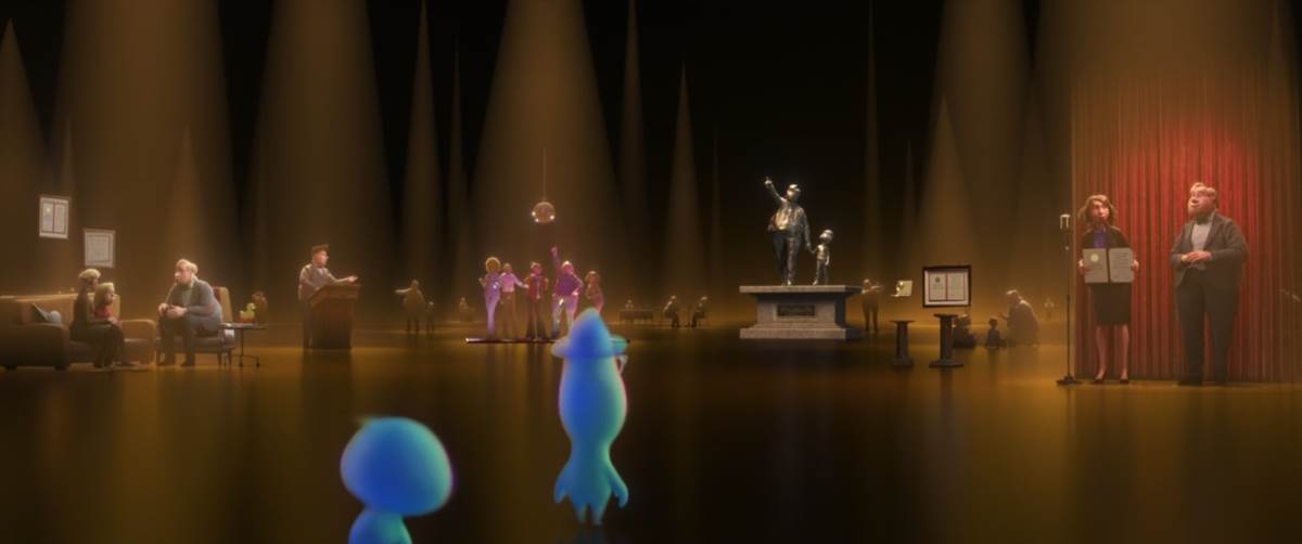 One shot within the Hall of Everything shows a soul interacting with Luxo Jr., the famous little lamp from Pixar's very first animated short. Look for it towards the rear-center of this image, near (appropriately enough) a piano.