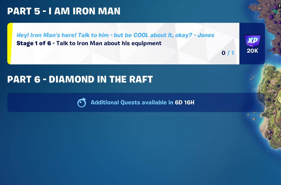- Talk to Iron Man About His Equipment – A pretty straightforward challenge, especially if you track your quests. Just north of Grim Gate, you’ll find Iron Man. Simply talk to him to complete this Story Quest. Players will learn that Iron Man heard about the fight against Dr. Doom, and to show his support he has spread Stark industries tech all over the island. Jones will then chime in, excited about Tony Stark’s return to the battle, he will talk about the prophecy from The Oracle. Maybe Iron Man is the hero that is set to take down Doom.