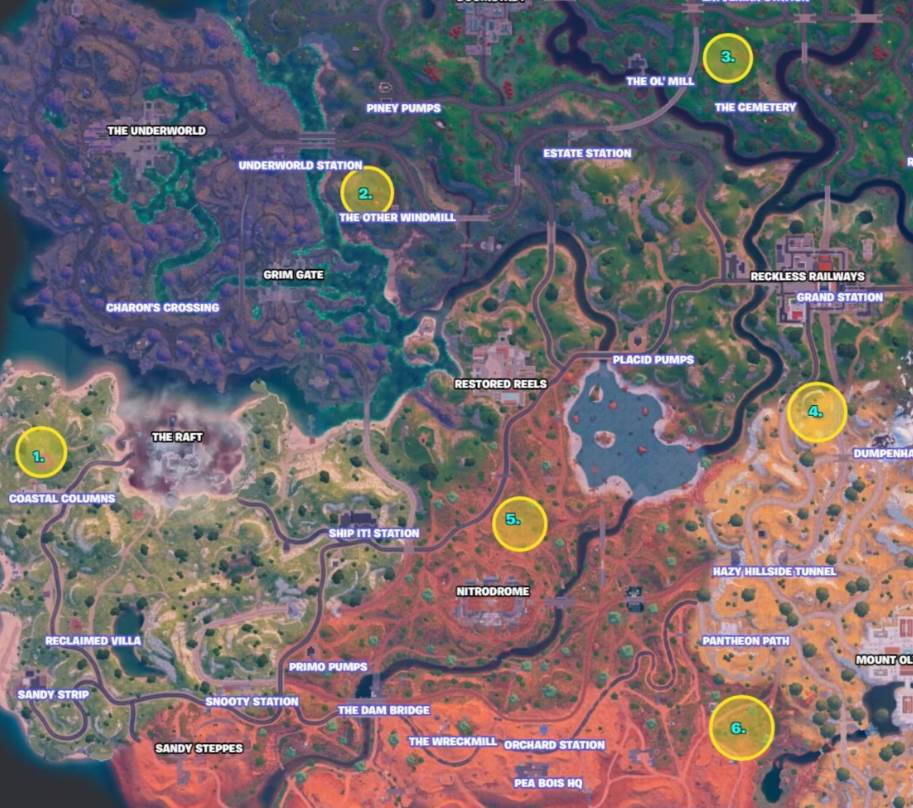 - Search a Stark Industry Chest – This is also a fairly straightforward task. Throughout the map, new Stark Mobile Armory drop sites have appeared. With only 6 chests throughout the map, you’ll need to be strategic about where you land. The six sites include both windmill landmarks, north of The Cemetery, North of Coastal Columns, Northwest of Dumpenhausen, East of Ship It! Station, and East of Pea Bois HQ. You can also check out a more detailed map of all the locations below. After opening one of the chests, you’ll be prompted to complete your next task.
