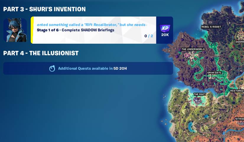 - Hold 3 Different Epic or Better Items at One Time – This challenge is incredibly easy. Players must have three items that are purple or gold rarity. They don’t need to be taken from eliminated players like last week. Upon completing my SHADOW Briefings, I already had them in my inventory. It completed automatically. Upon finishing this challenge, you’ll be sent to hand over the parts for the recalibrators to Shuri.
