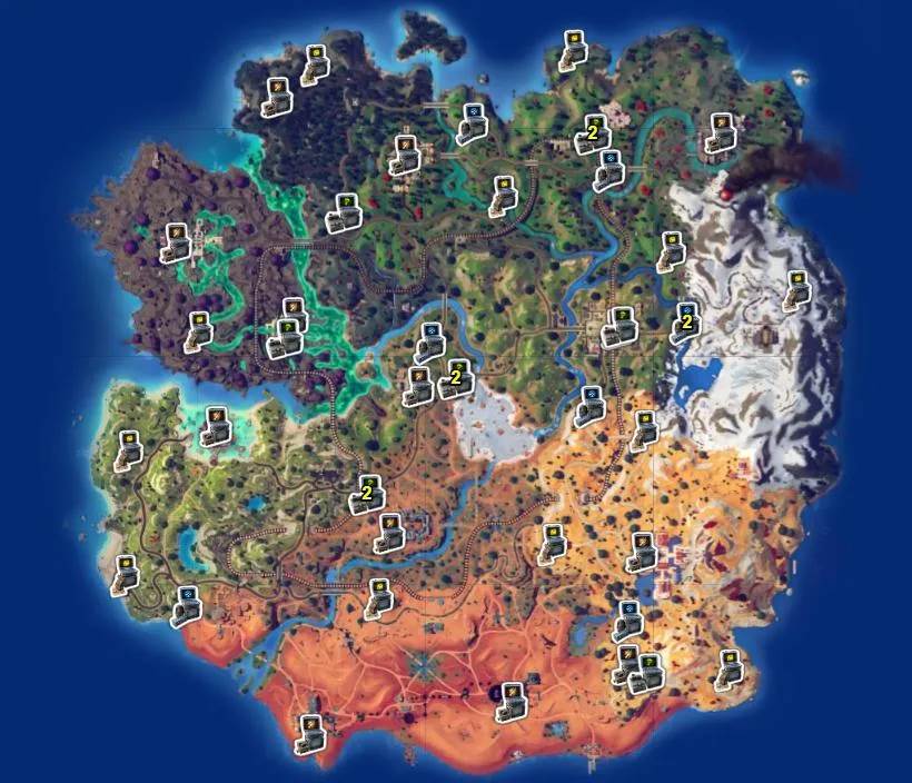 - Complete SHADOW Briefings – The hardest part of this challenge is locating the computers to start the SHADOW Briefings. Below you’ll find a map of all computers on the map. For me, I visited Doomstadt. Underneath a bridge next to the main plaza of the point of interest (POI) you’ll find one of these computers. Interacting with this particular computer will allow you to choose one of three different weapon challenges. Upon selecting the mission, you’ll have an indicator in the upper left-hand side that will tell you how long you have to complete it. You’ll need to do this twice, and it can be done in the same match from this same computer. Other computers may offer supply drop pickups or vehicle spawns, which can only be performed once a match. After completing the first SHADOW briefing, you’ll be included in a call between Hope and Jones. Shuri thinks she can use recalibrators on the Rift beacons around Castle Doom to send Doom through a controlled Rift away from the island. Players must get the parts to her so we can attempt the tech on Doombot, who we need to defeat to expose where Doom is hiding.