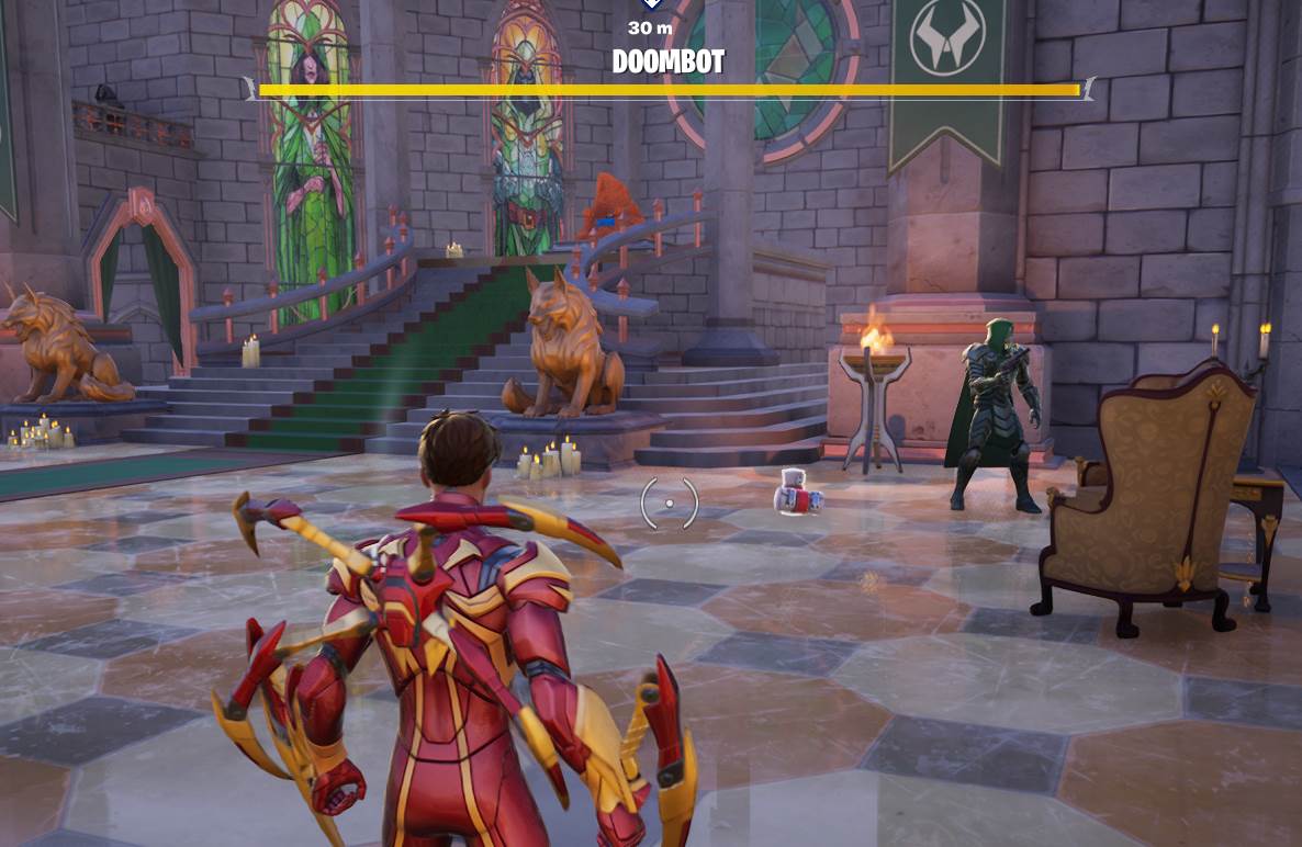 - Defeat Doombot – This is, by far, the most challenging quest of the week. Doombot is one of the island's three bosses, and he can only be defeated once per match. You’ll need to make the final shot to complete this challenge. As you begin fighting Doombot, Hope will inform you the Rift beacons are short circuiting, making the efforts of the heroes futile. But once the fight has started, you’ll have to finish it. Be very careful during this fight. Doombot has several high powered attacks that can knock your health and shield levels down dramatically. Another issue in this fight is his Latverian Army. After knocking out all of Doombot’s shield, an army of the NPCs will arrive to try and stop you from taking down the boss. Something else to look out for is other players. There were several times where I had almost taken Doombot down only to be eliminated by a nearby opponent. Some players will wait in the balconies, let you do most of the work, and take you down before finishing Doombot out themselves. Maybe that’s a strategy you can use if you are struggling to defeat him. After destroying Doombot, players will hear from Doom himself. In a message directed at Hope, Doom warns her that, while she may be the prophecy of Pandora’s Box, he is judgment and he intends to win the war.