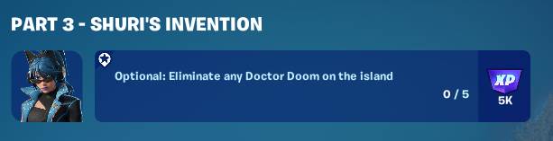 - OPTIONAL: Eliminate any Doctor Doom on the Island – This quest requires you to eliminate other players wearing the new Dr. Doom skin unlocked through the Doom Quests or a player who has acquired Doom’s armor from the Isle of Doom rift point. You can read more about these quests and the Isle of Doom here.