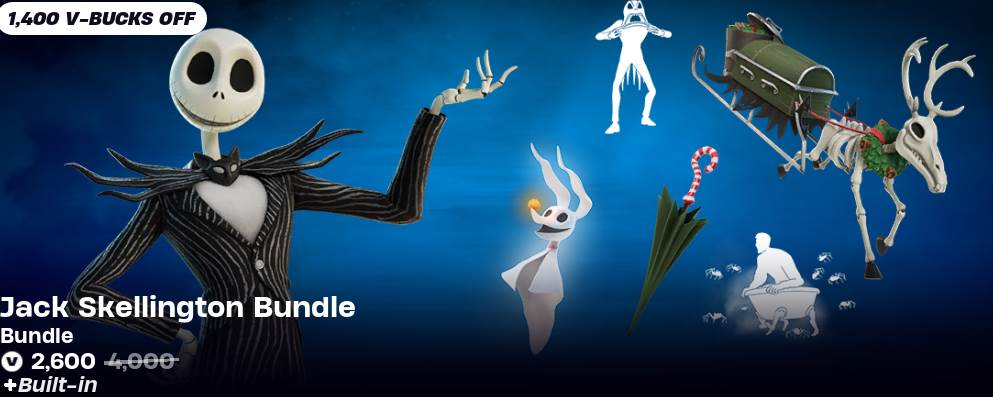 - The Jack Skellington Bundle, which costs 2,600 V-Bucks (Around $23.50), contains 8 different cosmetic items: