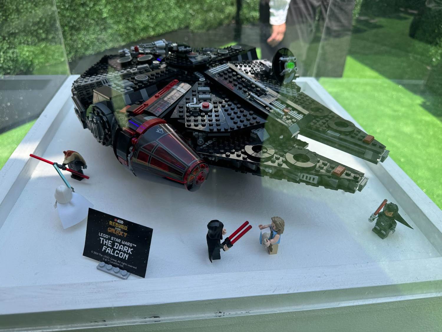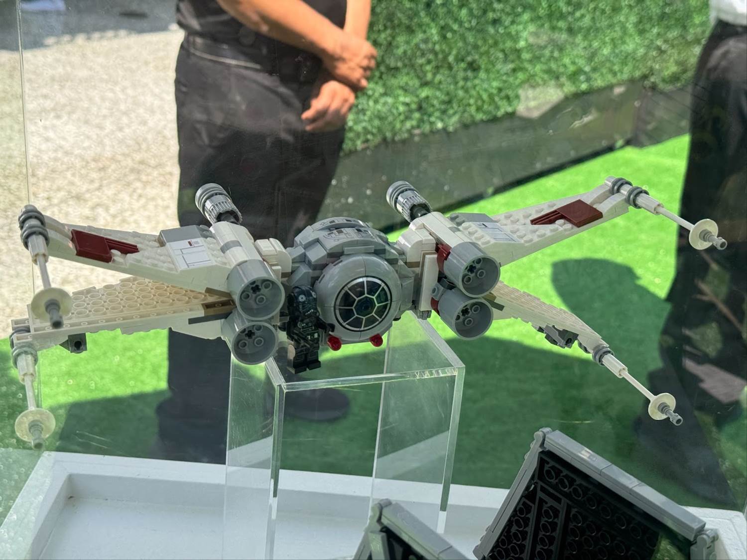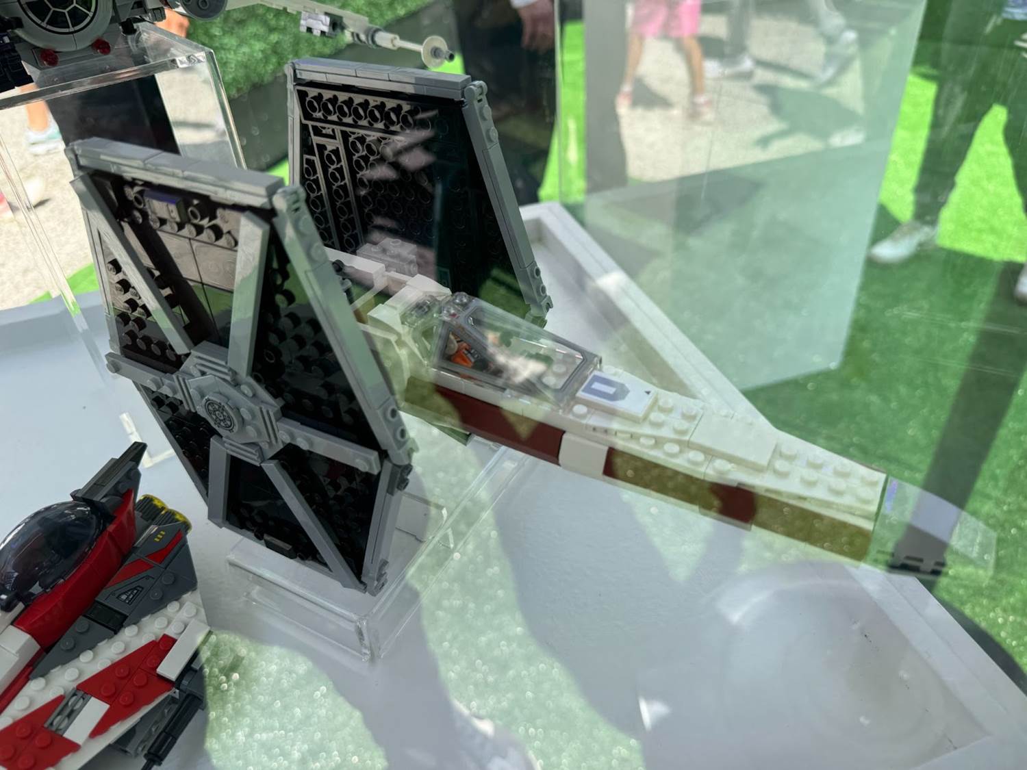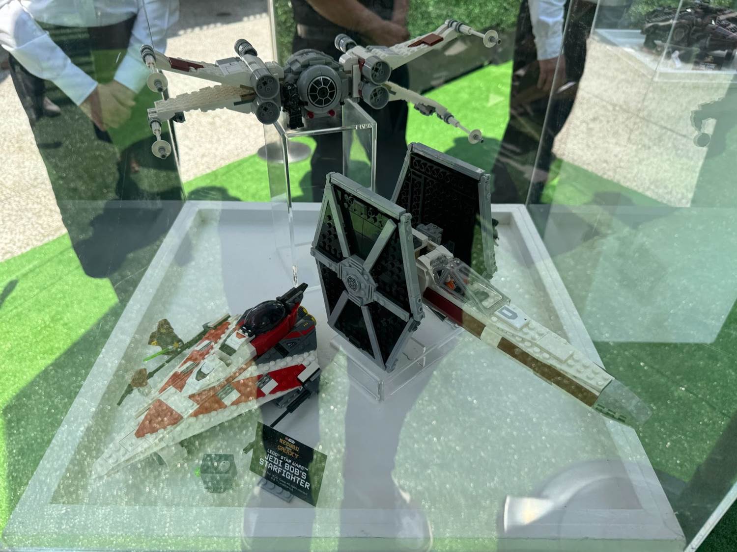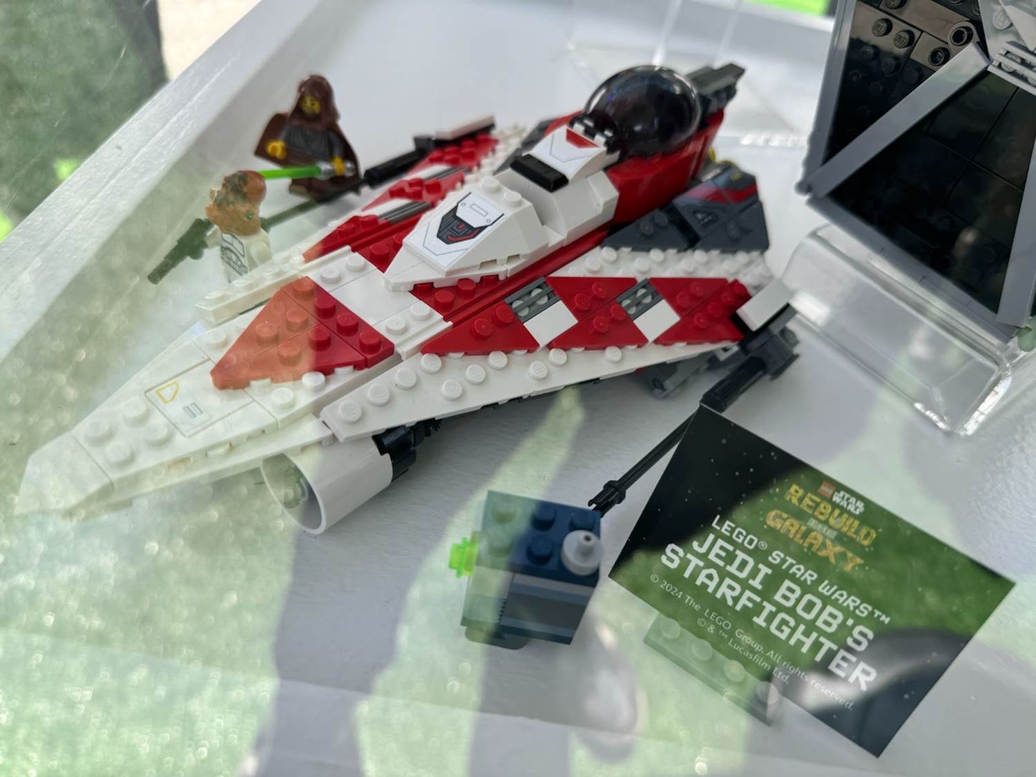 But this time there were also displays of the three new LEGO building sets tied into LEGO Star Wars: Rebuild the Galaxy– namely Jedi Bob’s Starfighter, the TIE Fighter & X-Wing Mash-Up, and the Dark Falcon– all with their respective minifigures.