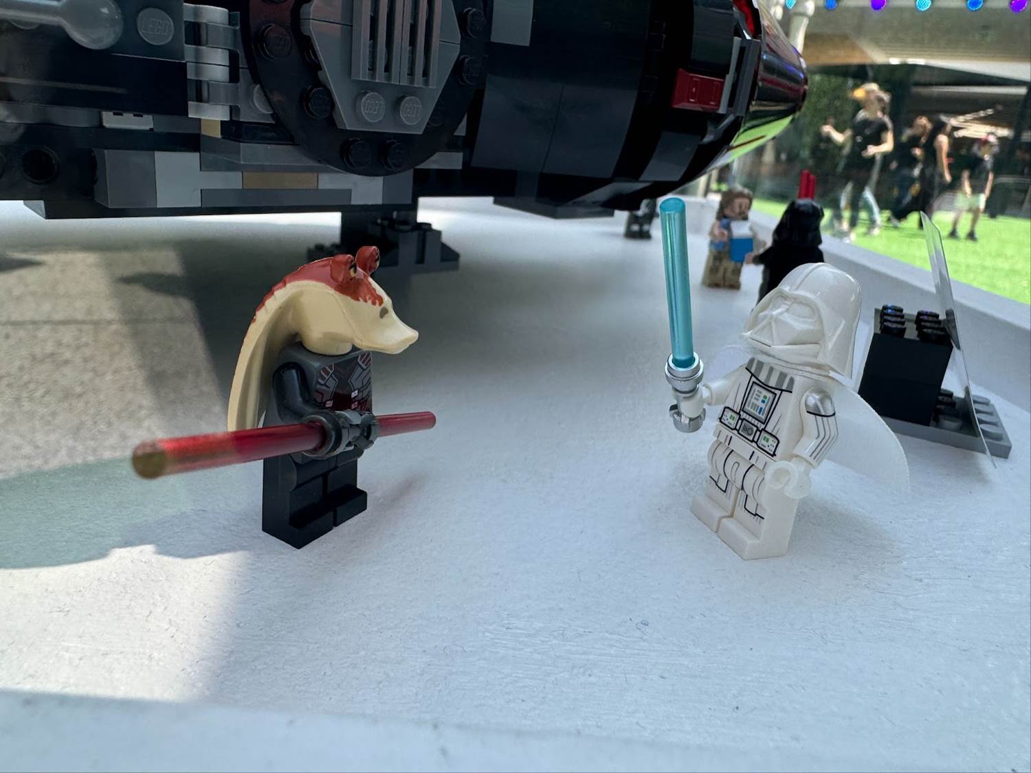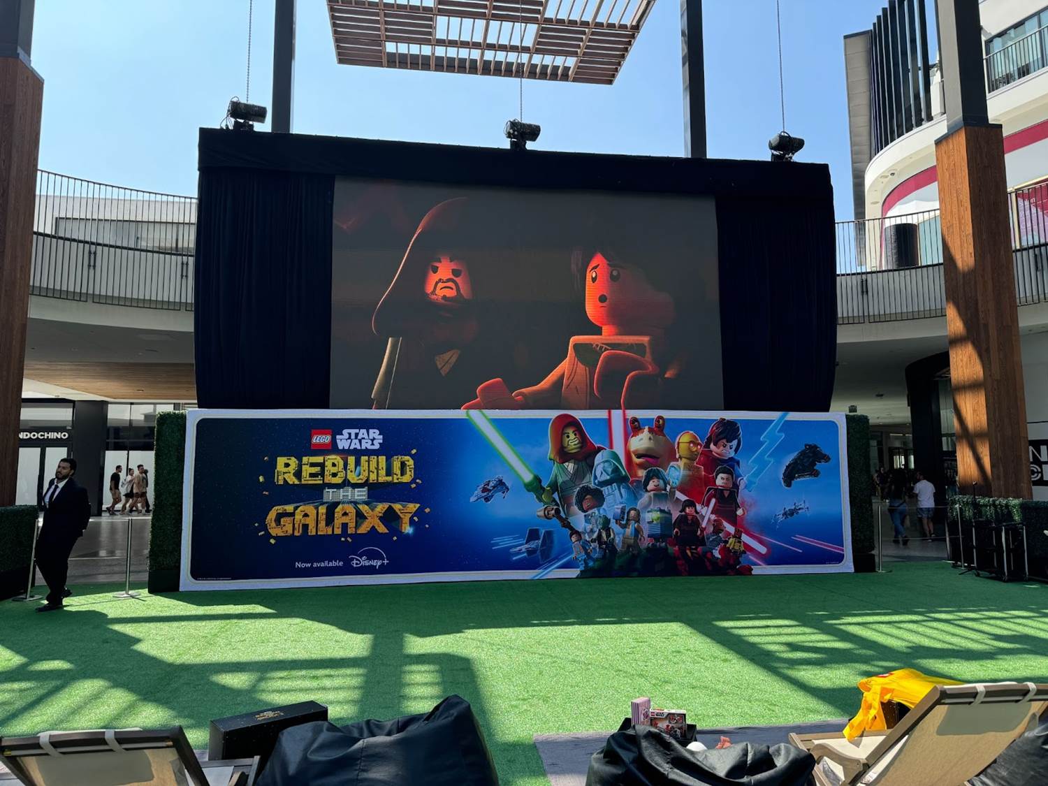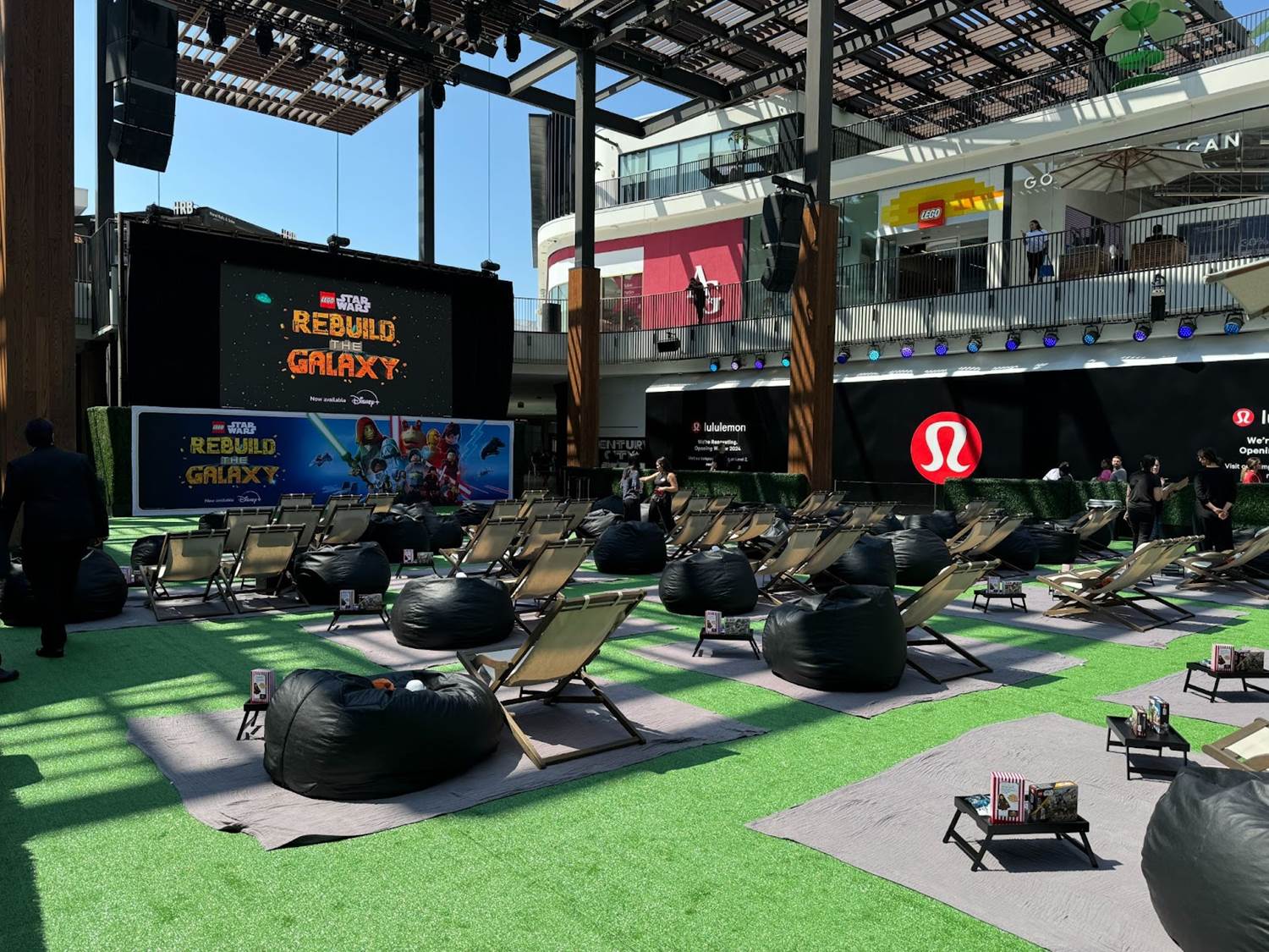 Yesterday afternoon, Laughing Place was invited to Westfield Century City mall in Southern California for an outdoor screening of the first two episodes of LEGO Star Wars: Rebuild the Galaxy, the new animated Disney+ miniseries from Lucasfilm. Though the event was invite-only, regular shoppers at the mall could easily watch the screening from outside the fenced-off atrium area.