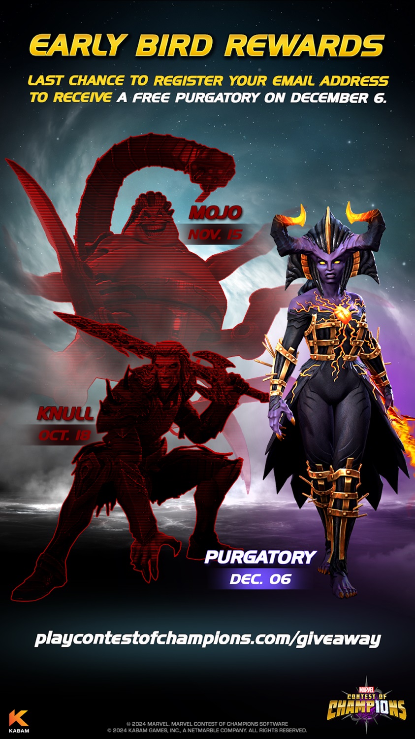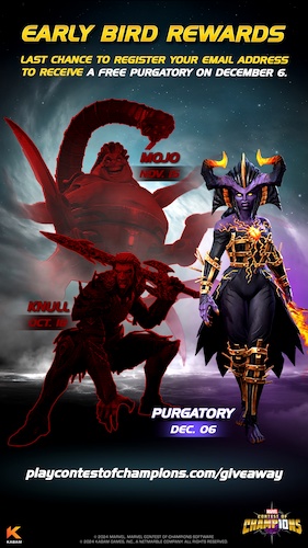 - Additionally, fans who register their email over at Playcontestofchampions.com by December 6th will receive Purgatory for free.
