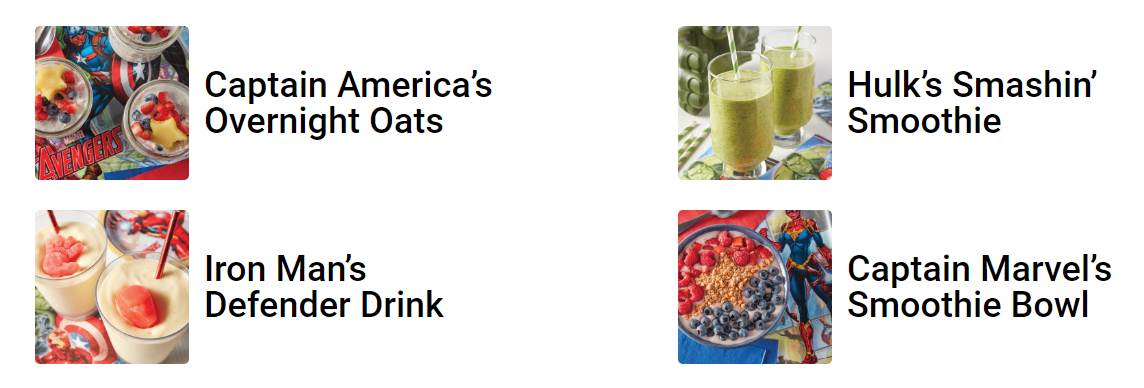 - For those who aren’t interested in enjoying a cup of milk can enjoy a recipe section, allowing families to enjoy the health benefits of milk with Marvel inspired nutritious snacks.