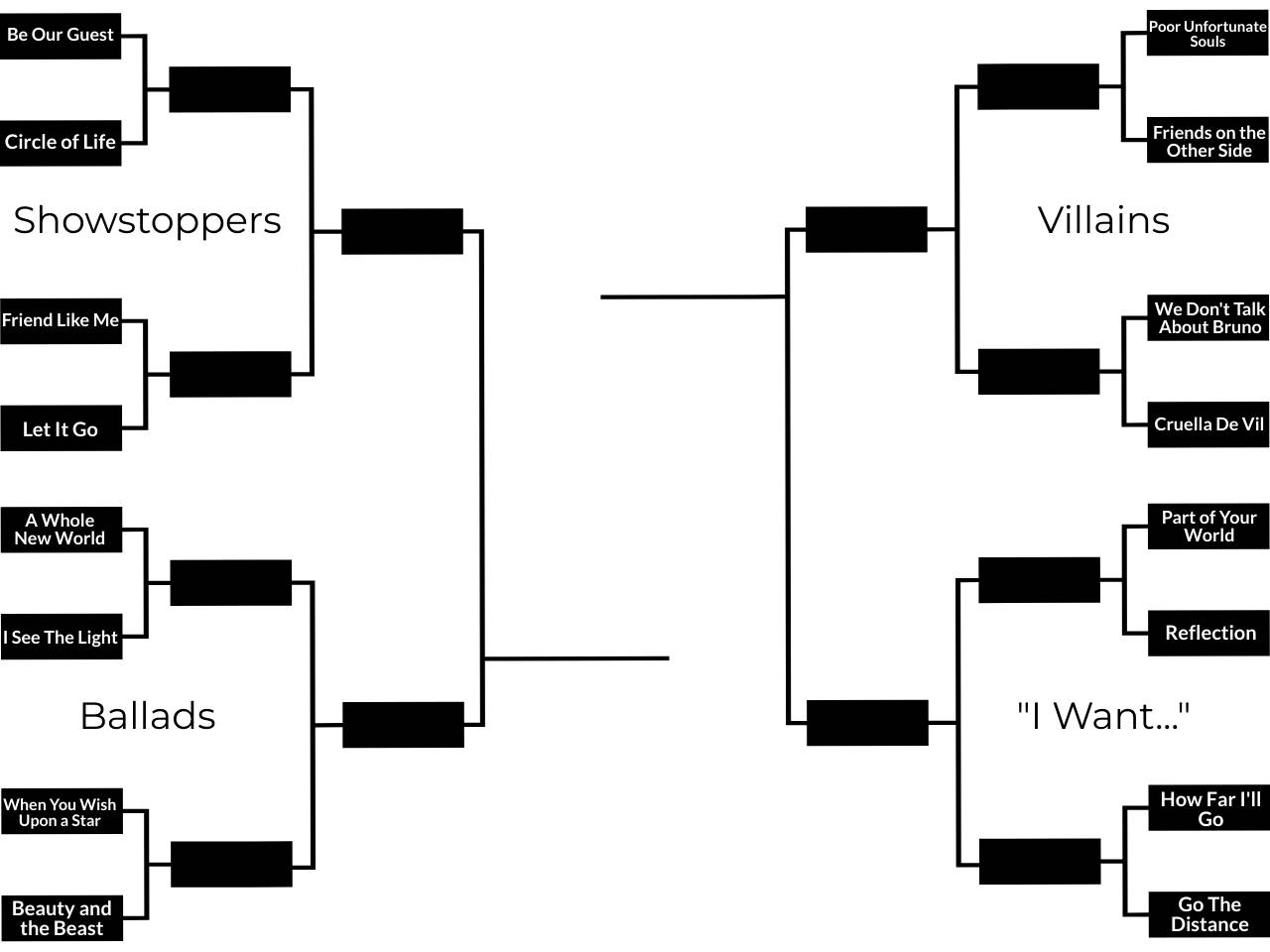 The first step was breaking the bracket into four regions. We eventually landed on the following four categories: Showstoppers, Ballads, Villains and “I Want…" (we’ll explain that one a bit later). After going back and forth regarding which songs could fit into which categories and painstakingly narrowing the field down to 16, we had our bracket.