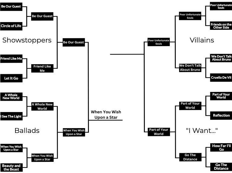 Before we move on to our next matchup, let’s take a look at our last result. Once again, it was not all that close as “when You Wish Upon a Star" cruises into the championship matchup. This song seems destined to win it all, but it still needs to knock off one more top seed to do it.