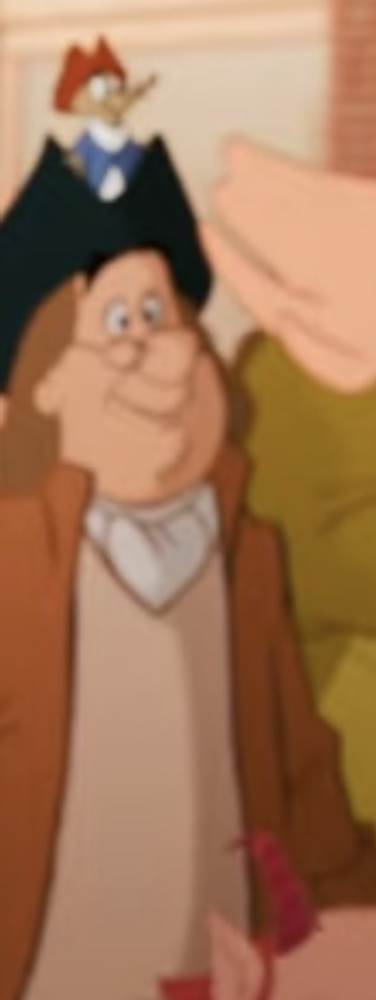 Not only do we see the Three Little Pigs, Captain Hook, Phil(octetes), Colonel Hathi’s Elephants, and Cinderella’s Step-Sisters, we also see Kuzco, Pacha, Louis from The Princess and the Frog (or is that Tick Tock from Peter Pan, we can’t see the face), and Luisa from Encanto replace the donkeys she normally carries with the cows from Home on the Range, Rutt and Tuke from Brother Bear, and possibly Cyril from The Adventures of Ichabod and Mr. Toad. But right next to them is Ben Franklin and a Mouse? WHAT?