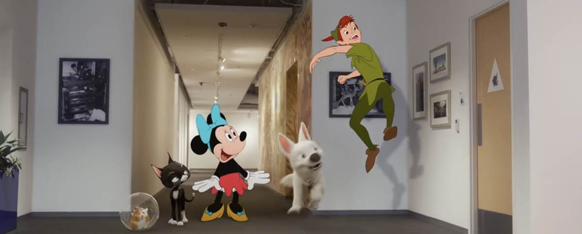 Together they round up a who’s who of characters that was an onslaught in just the trailer so I can’t even fathom what the full short entails. Bambi, Thumper, Flower appear, and as Peter Pan himself flies through the halls of the studio, uttering the all-but-trademarked “Here we go," we see him, Minnie, and the cast of Bolt all in the hallway before he takes flight.